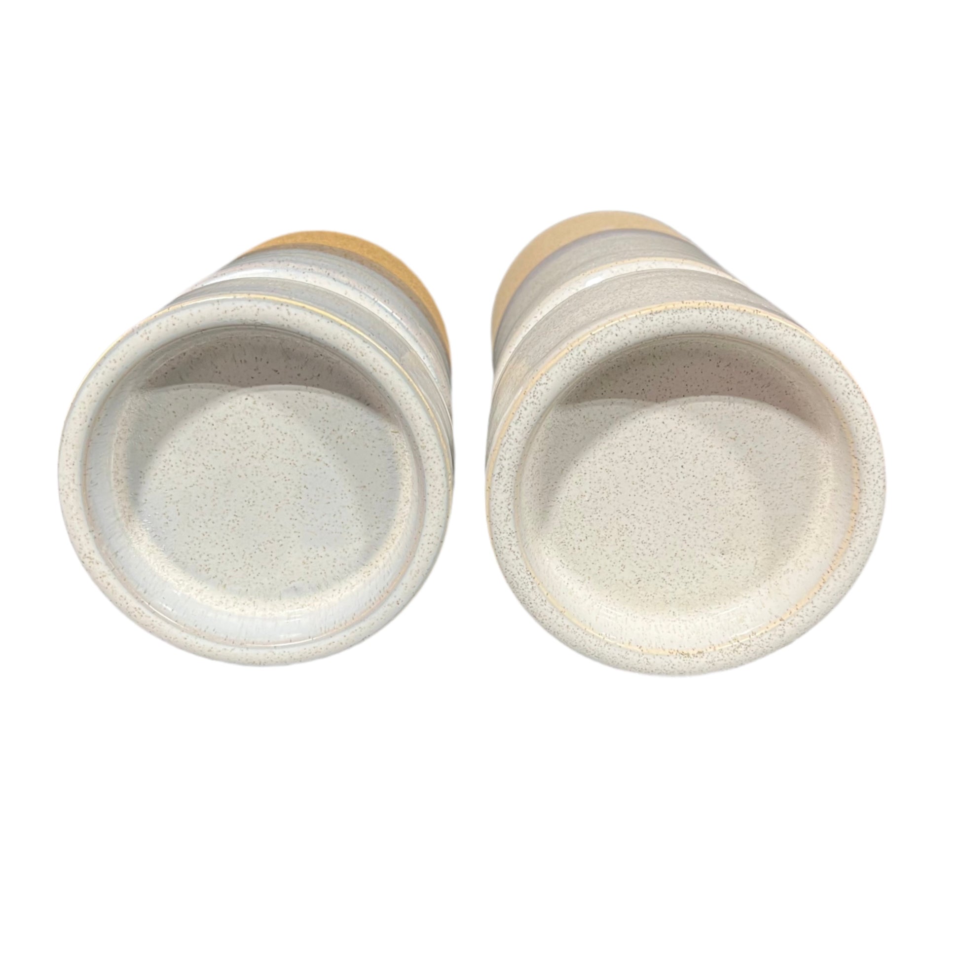 A pair of sculptural candle holders featuring a refined three-tone finish. Each piece combines modern minimalism with subtle color gradation, creating visual depth on shelves, mantels, or dining surfaces. Perfect for layering ambient lighting into contemporary interiors. Gently Used for Staging.