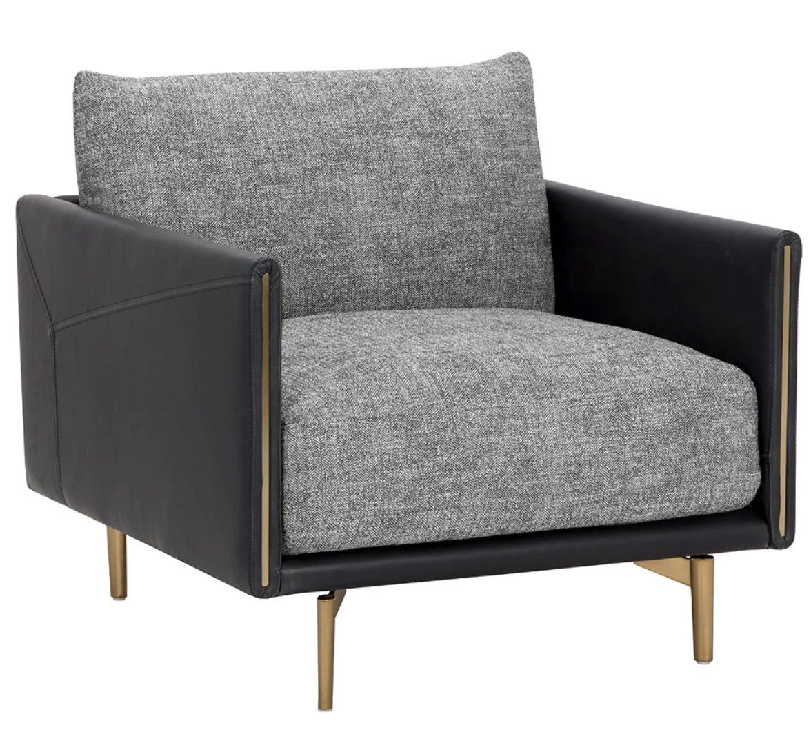 Mixed materials and contrasting colors give the Ashi Armchair an edgy design. Soft cushioning upholstered in nash zebra fabric provides ample comfort. Stitched detailing on the side of the arms gives a subtle geometric design that enhances the coal black faux leather frame. Satin brass aluminum on the legs and trim on the front of the arms ties the look together.