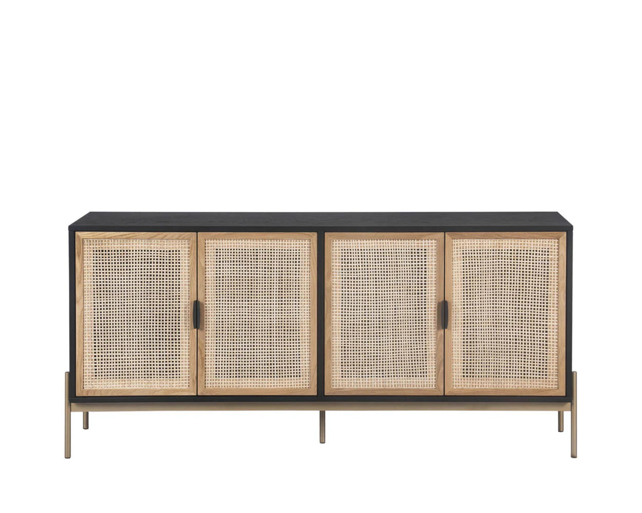 Create a space influenced by global travels with this stylish sideboard crafted in Indonesia. Features four natural rattan cabinets contrasted with a black oak wood frame. Gold iron feet and matte black steel handles complete the design.