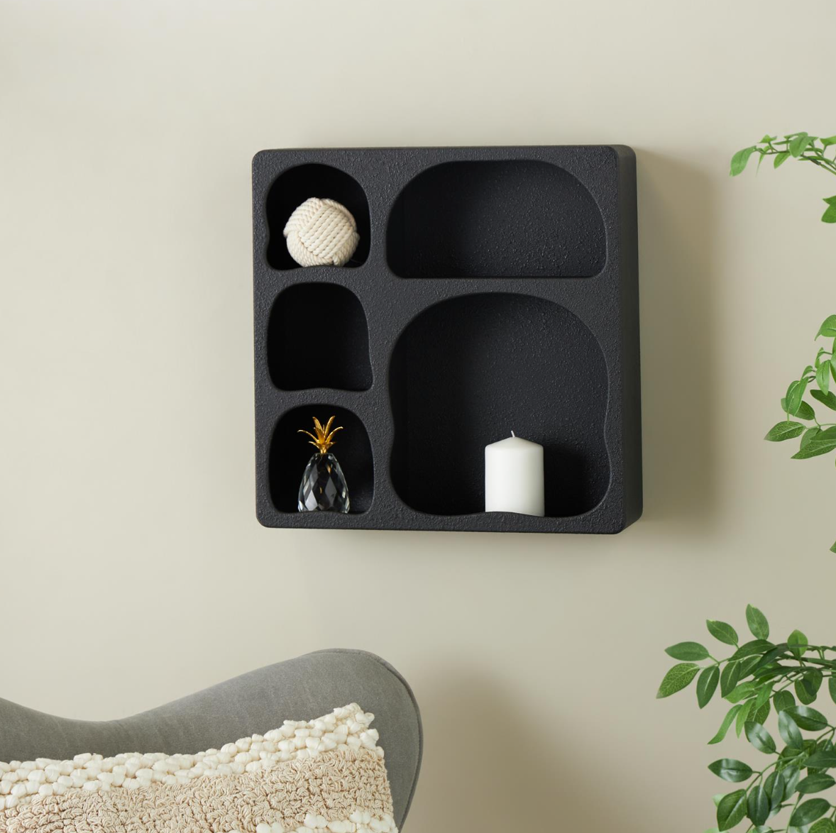Indulge in the luxurious beauty of sleek refinement and precise lines with this minimalist design. Offering effortless opulence through monochromatic hues and striking, angular structures, the Black Wood 5 Shelf Wall Shelf exudes sophistication. Crafted from high-quality wood and iron for enduring style and durability, this square wall shelf features a sleek black finish and textured surface for a modern touch. With five spacious shelves, it provides ample storage space for all your decorative items. Measuring 18.95L x 5W x 19H inches and weighing 8.77 lbs, this textured black floating shelf boasts a square shape that perfectly complements its arched and semi-circled shelves, adding depth and dimension to the overall look. Keep it clean with a simple wipe of a dry cloth as this modern mounted wall shelf, with its geometric design and sturdy iron brackets, elevates your space to new heights.