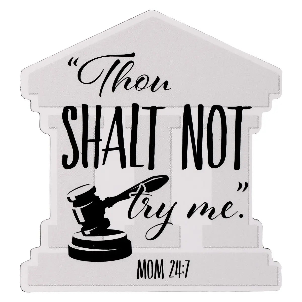 Thou Shalt Not Try Me Magnet – A witty die-cut magnet with a gray courthouse and gavel design—perfect for moms who need a little humor (and a warning sign).