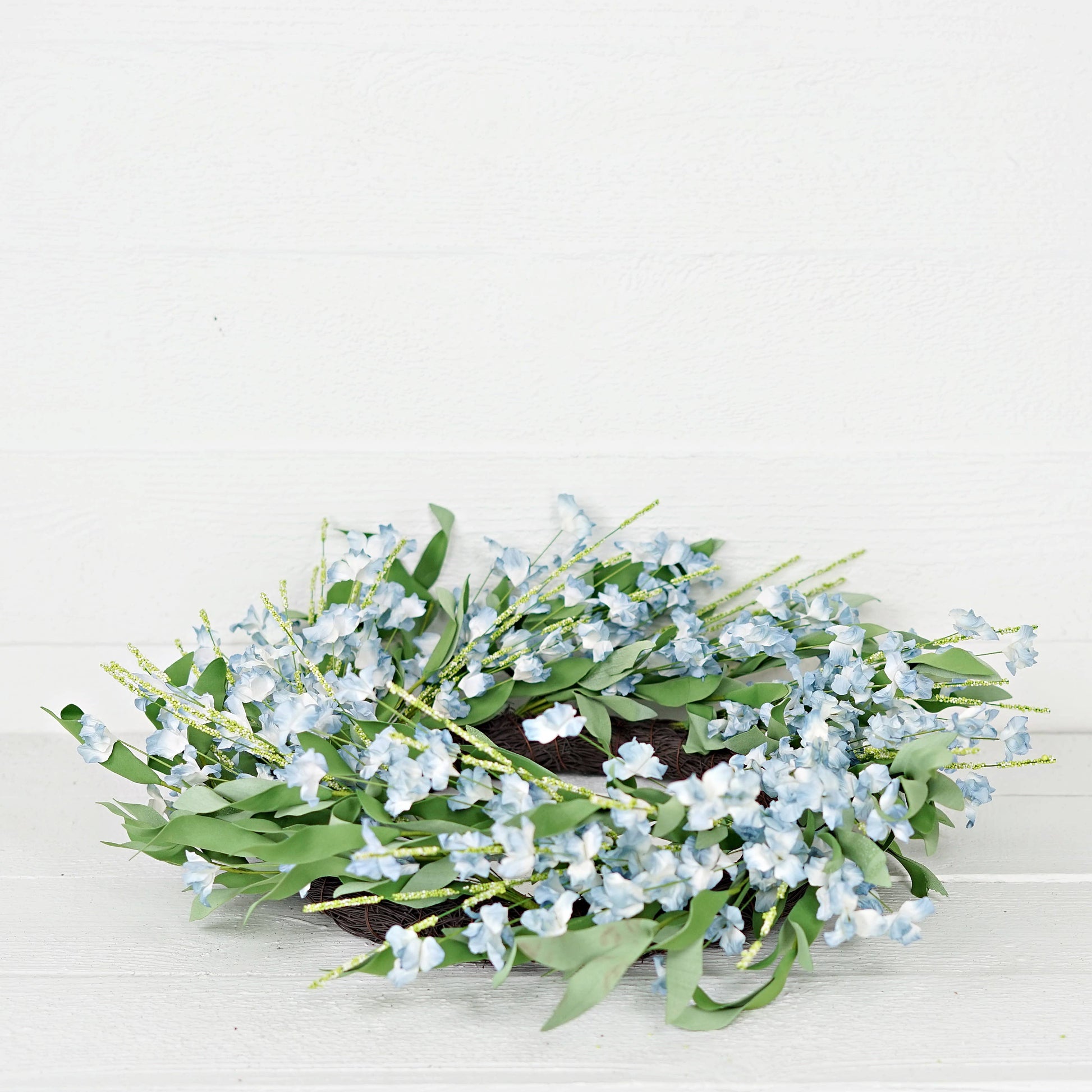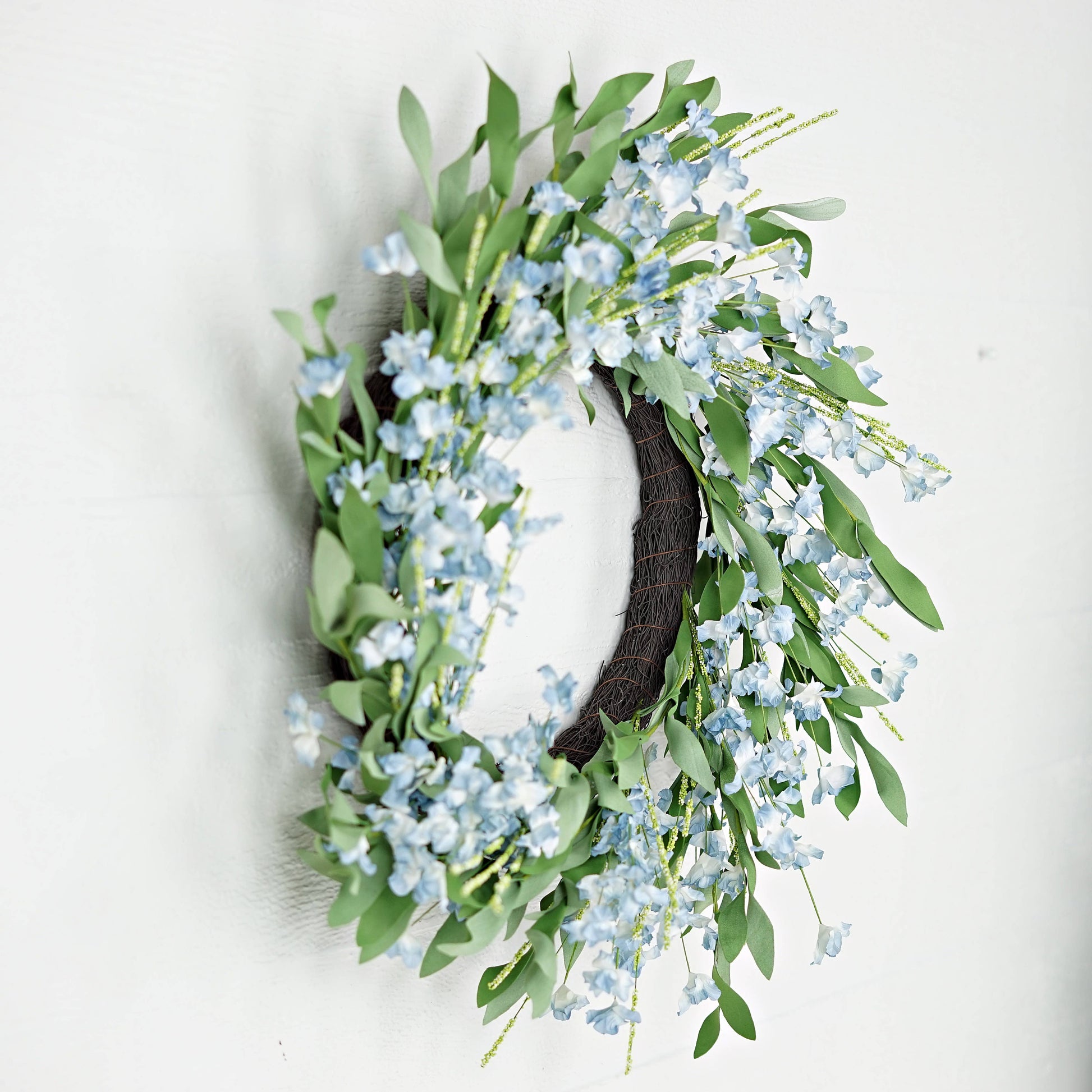 A sophisticated 24-inch wreath featuring delicate mountain flowers in serene blue and cream tones. This versatile piece transitions seamlessly from spring celebrations to year-round décor, bringing natural elegance and refined botanical charm to any entryway or interior space. Crafted with attention to detail, it's the perfect statement accent for modern, minimalist, or transitional home aesthetics.