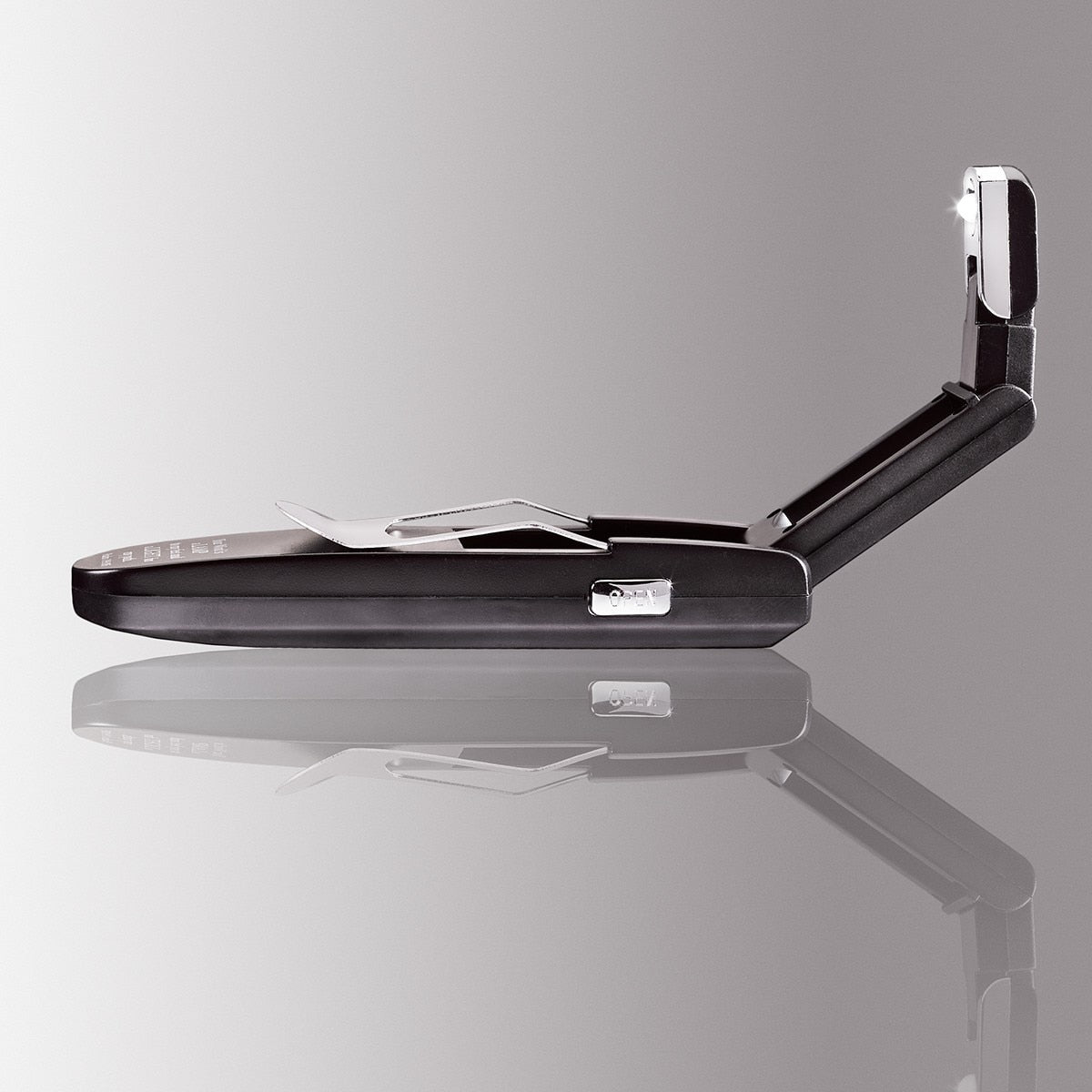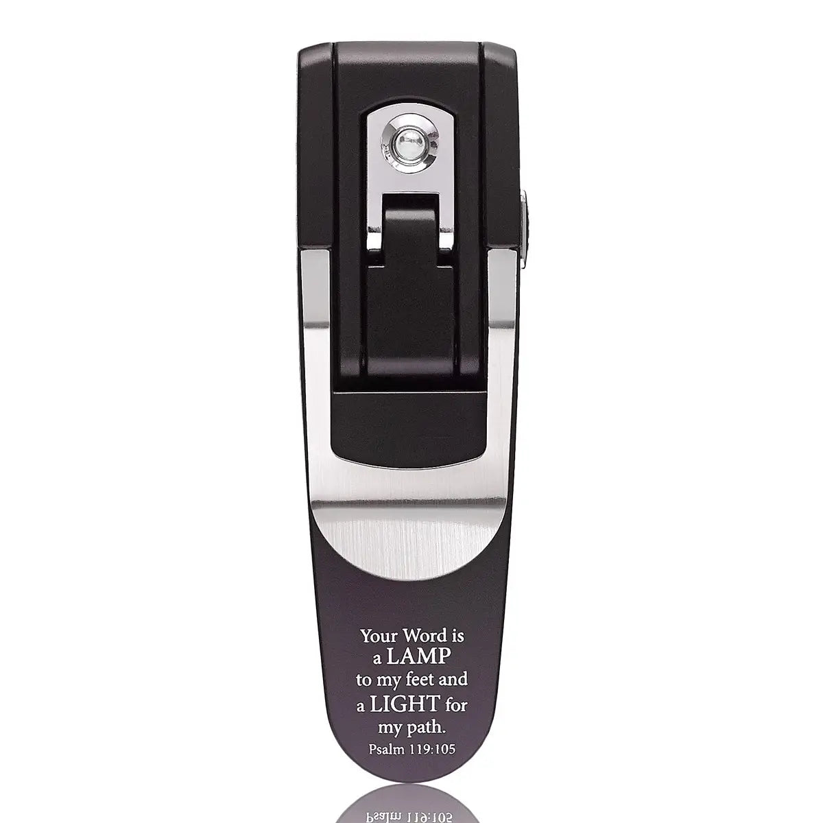 The Black Hydraulic Pop-Up Book Light is a handy accessory for readers at home and on the go. This travel-friendly book light's nifty design is sleek and compact, and it fits into any carry-on bag. Black hydraulic book light, Black polymer, Silver scree-printed text, Your light is a lamp to my feet and a light to my path., Psalm 119:105, Silver metal clip, Adjustable, Clip-on light, Automatic, Brilliant bright LED, Compact size, Durable, Lightweight, Batteries included, Blister pack packaging, Size: 4.8” x 1.5” x 0.8” (123 x 38 x 20mm)