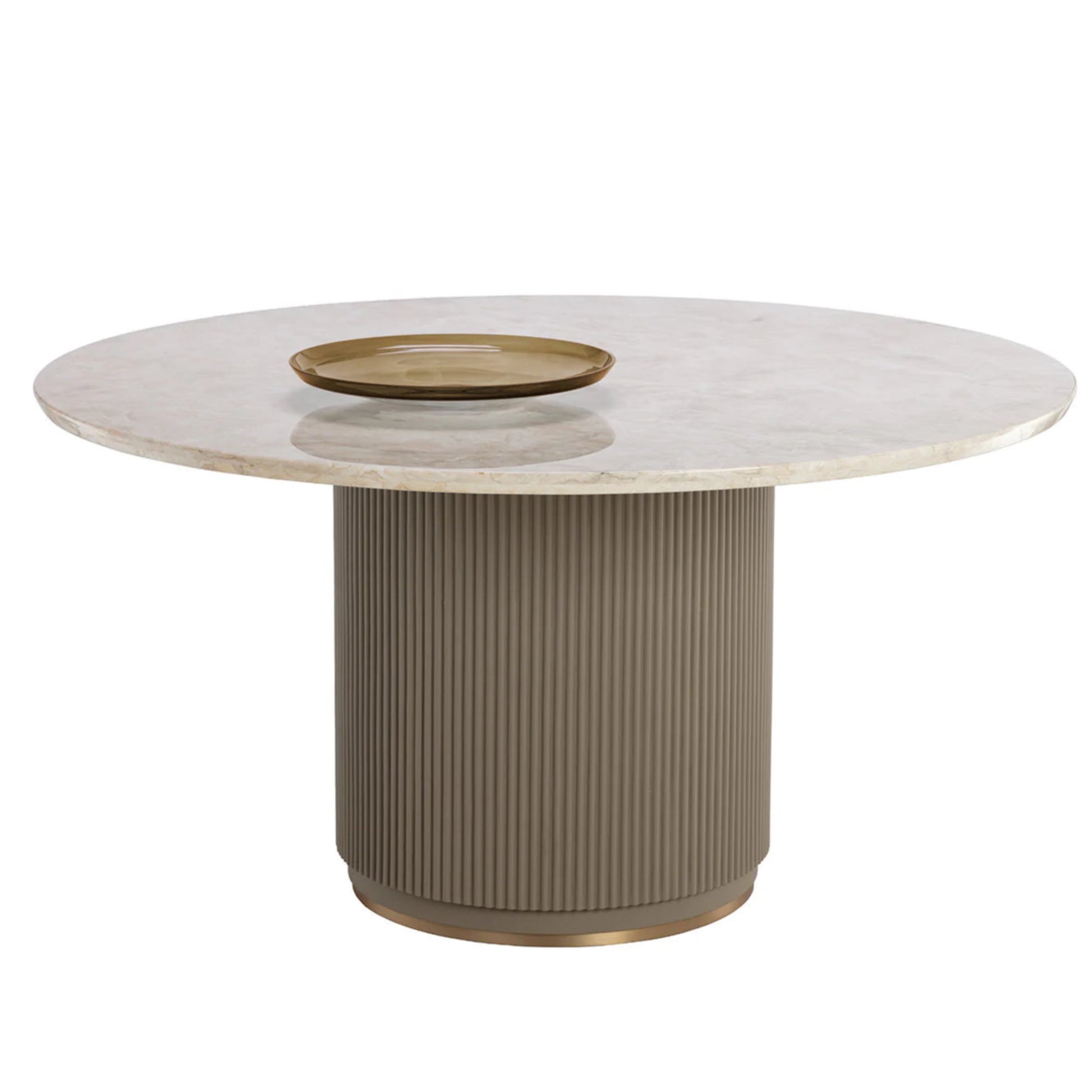 Description: The Cataldi Dining Table boasts a stunning blend of mixed materials and an architectural touch. The taupe faux leather base, featuring fluted detailing, adds depth and contrast to the sleek beige marble tabletop. The gold stainless steel trim at the base adds a luxurious touch. As marble is a natural material, each piece will have unique markings and variations that add to its beauty. Please handle with care as the faux leather may have natural characteristics such as color variations, wrinkles, and light scratches. No two pieces will be exactly alike, making this table truly one-of-a-kind.