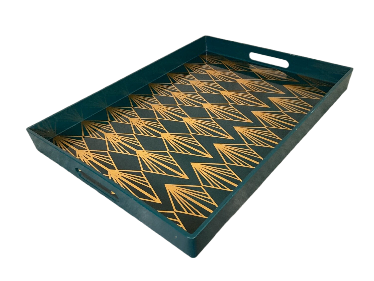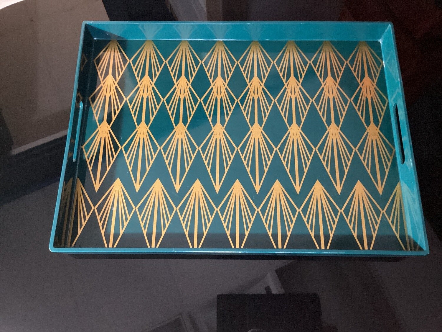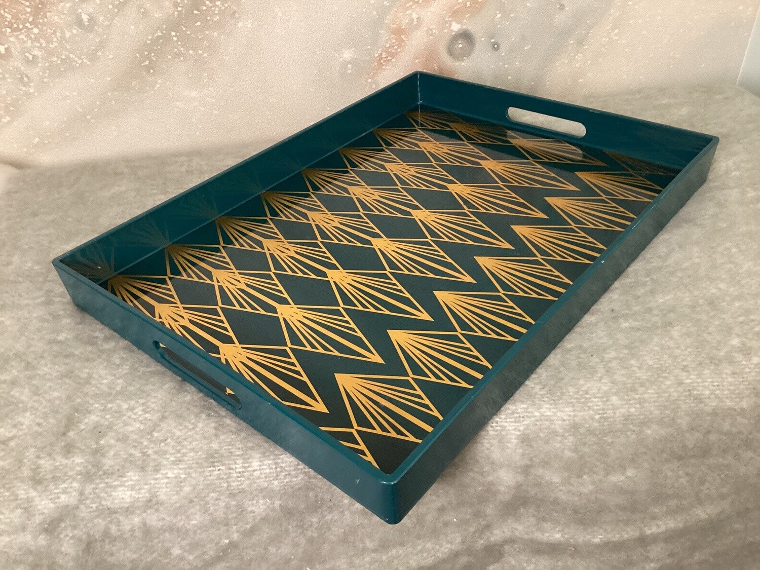 Elevate your décor with this stunning teal tray, featuring an elegant Art Deco gold design that adds a touch of vintage sophistication. With its bold color and intricate detailing, this tray is both a functional and stylish accent piece.