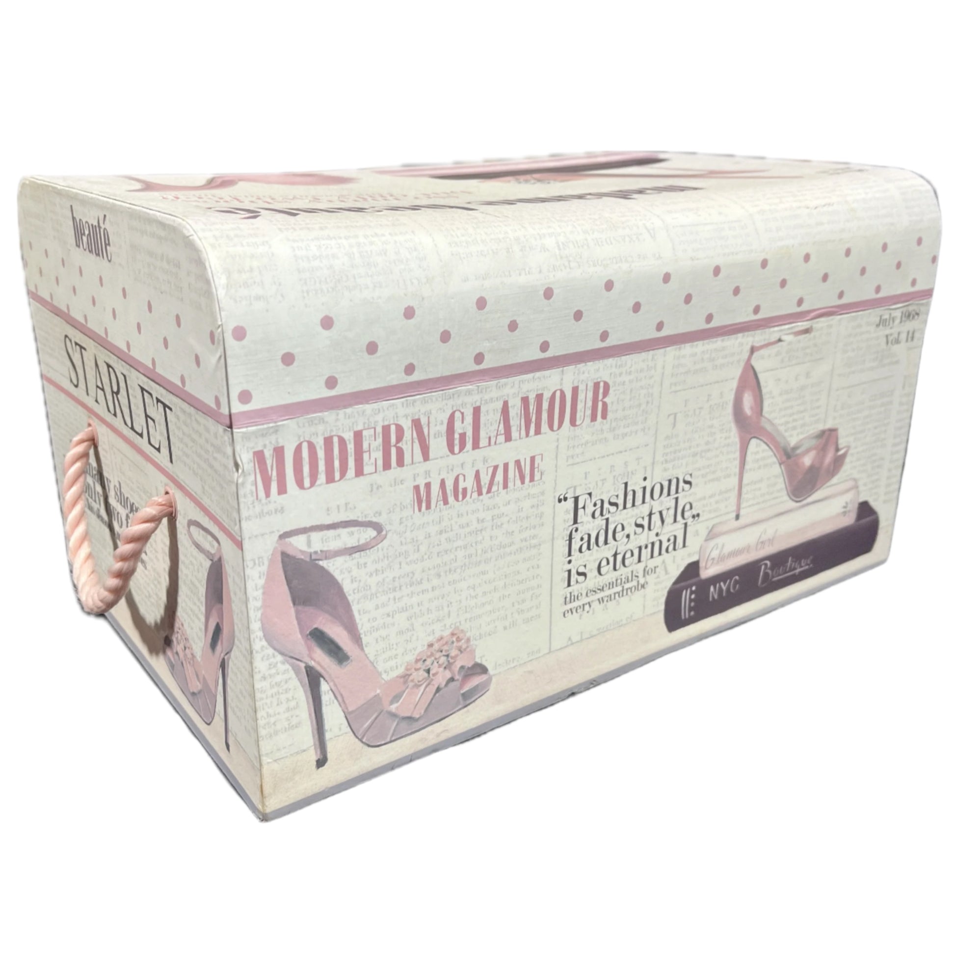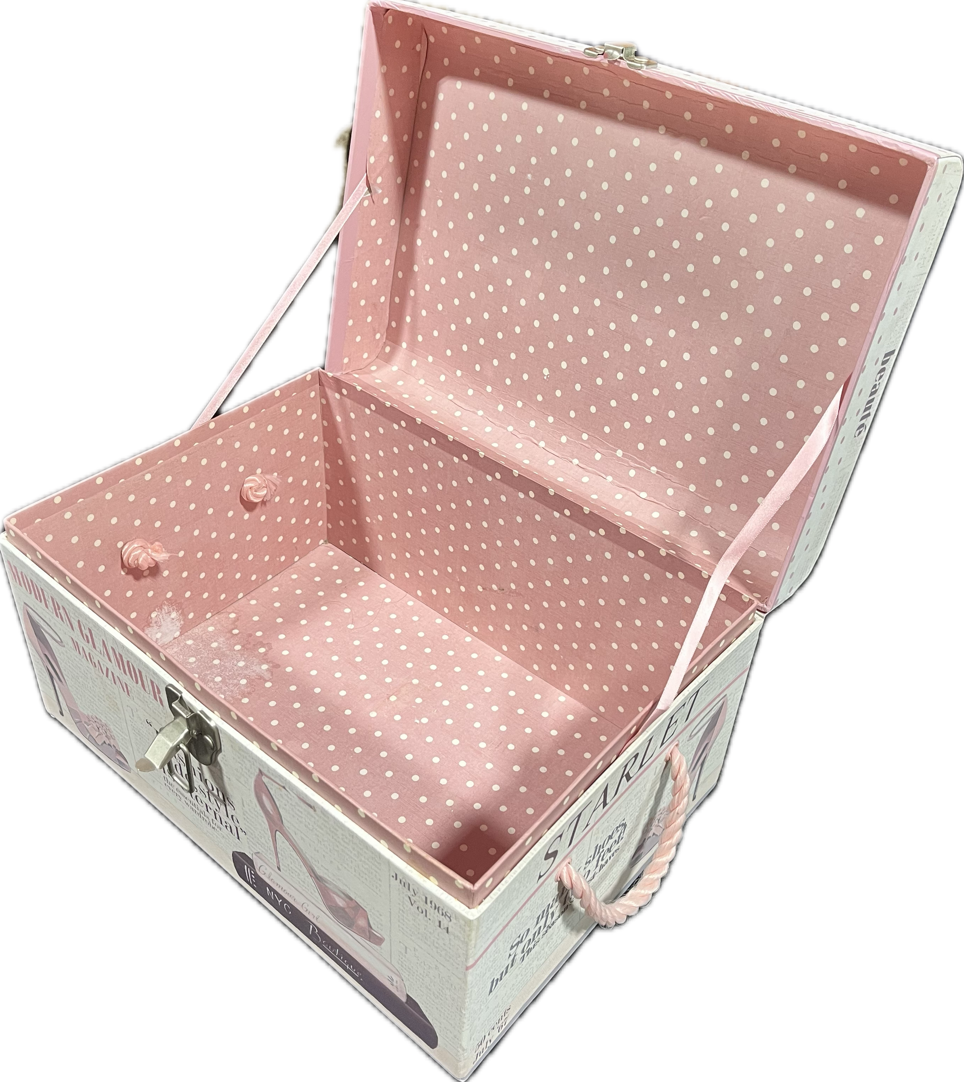 This glam-style keepsake storage box features elegant pink rope handles, adding a touch of sophistication. Measuring 10" x 14" x 8", it's perfect for storing cherished items while enhancing your décor.