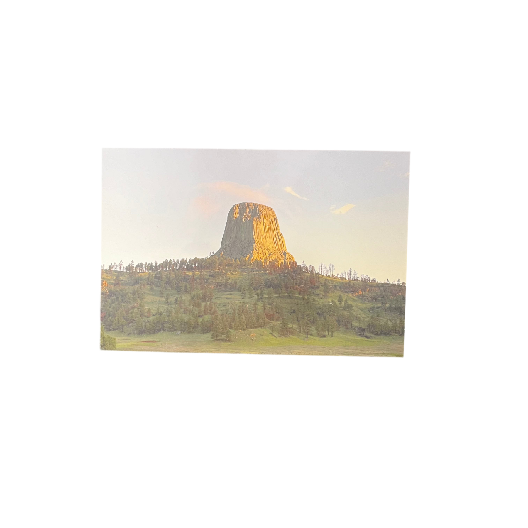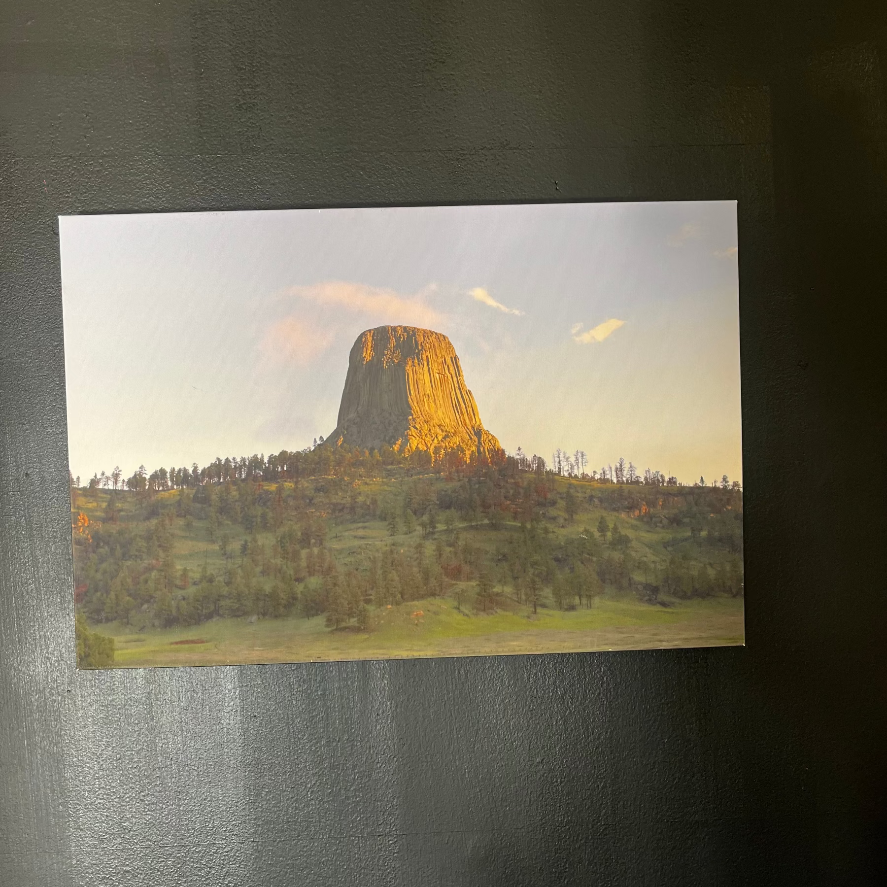 This wall art features a beautiful depiction of Devils Tower National Monument in Wyoming, known for its distinctive geological formation. The image captures the tower in warm, golden light, possibly at sunrise or sunset. One Of a Kind