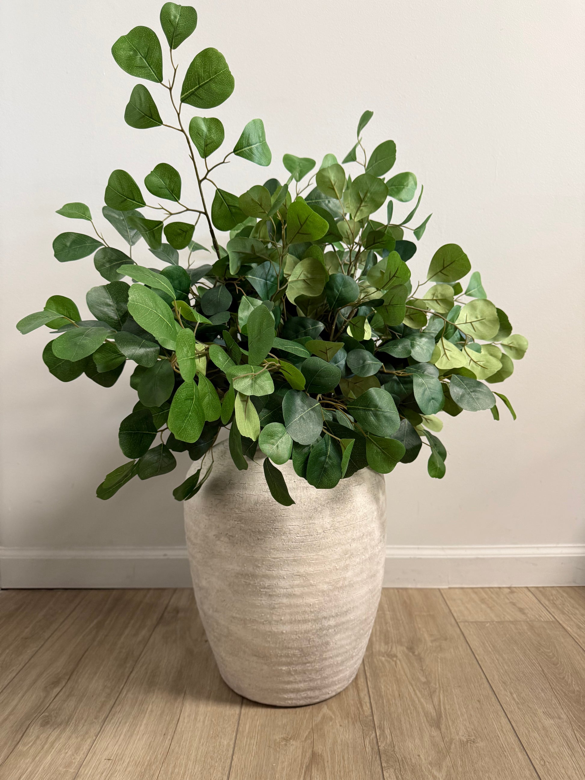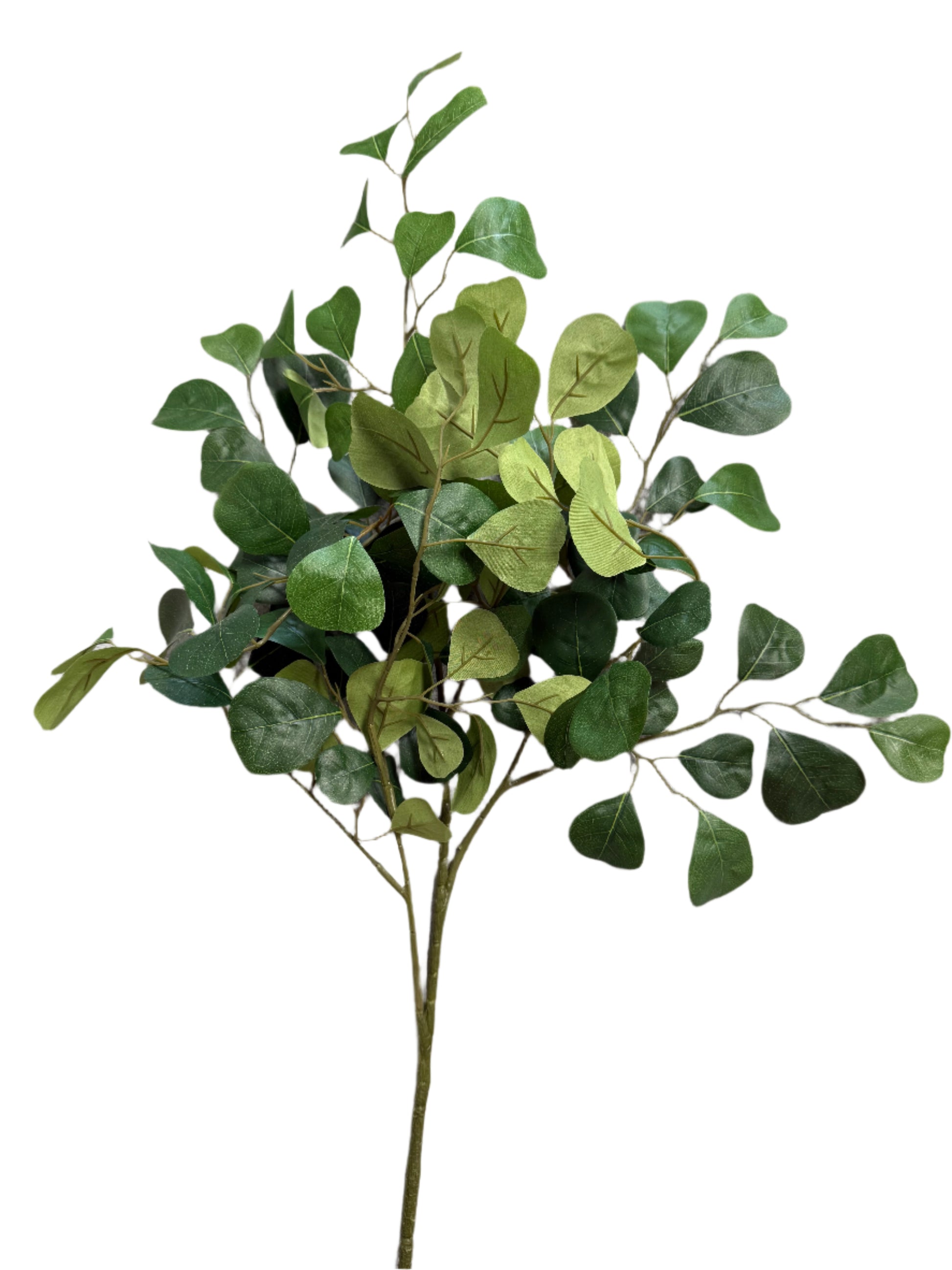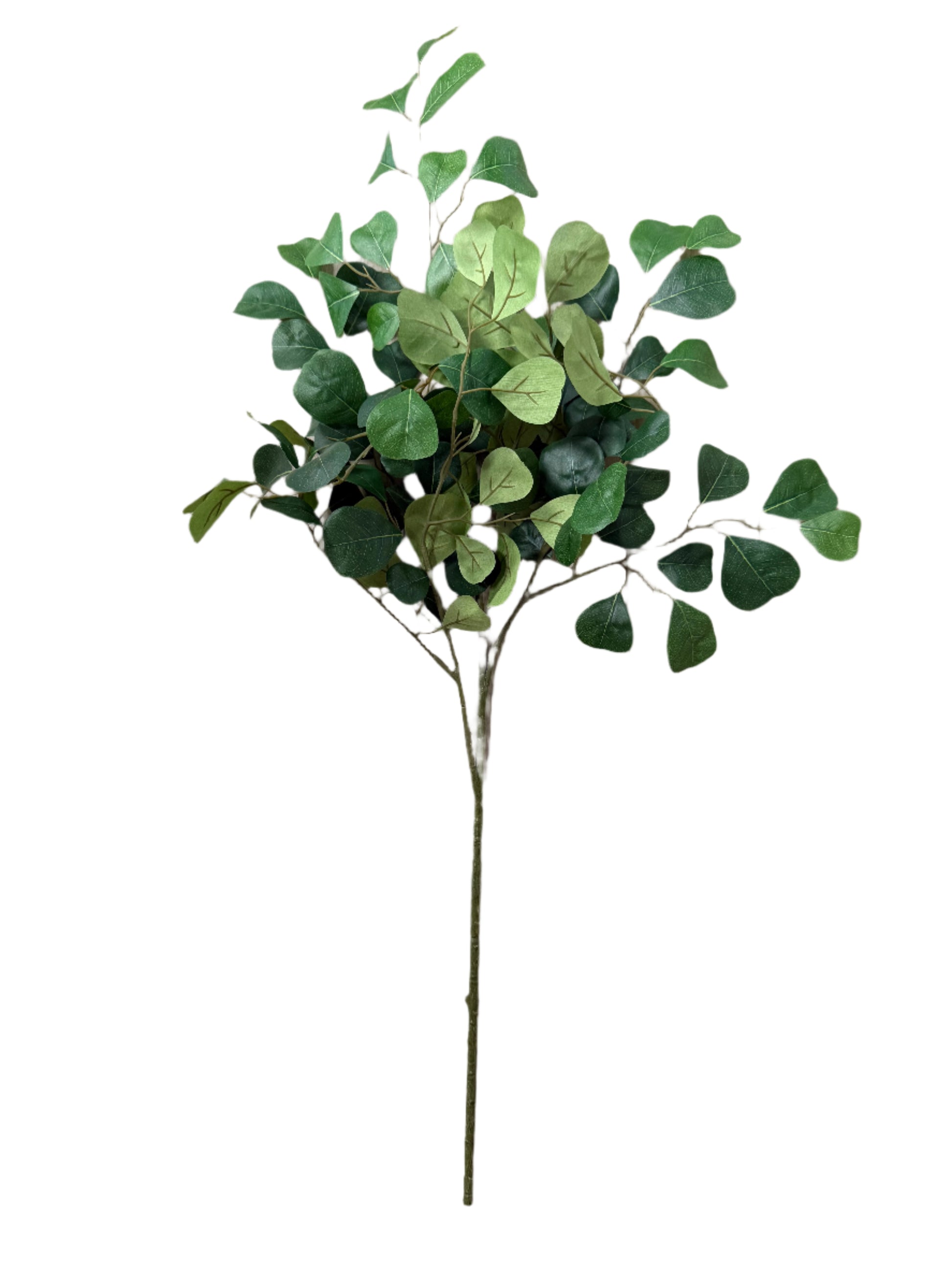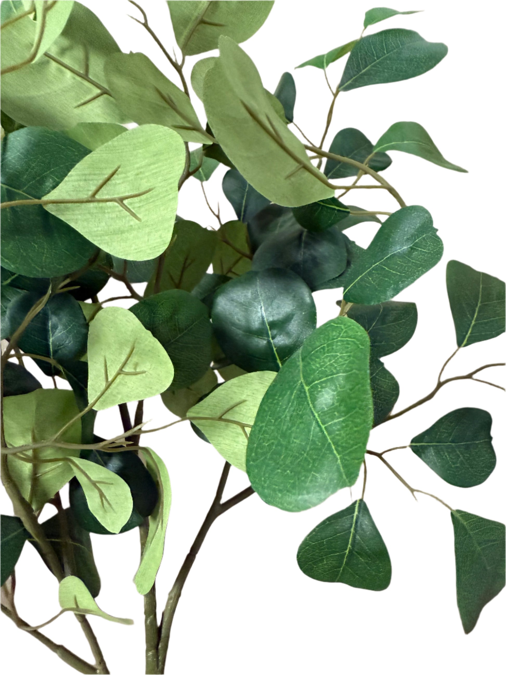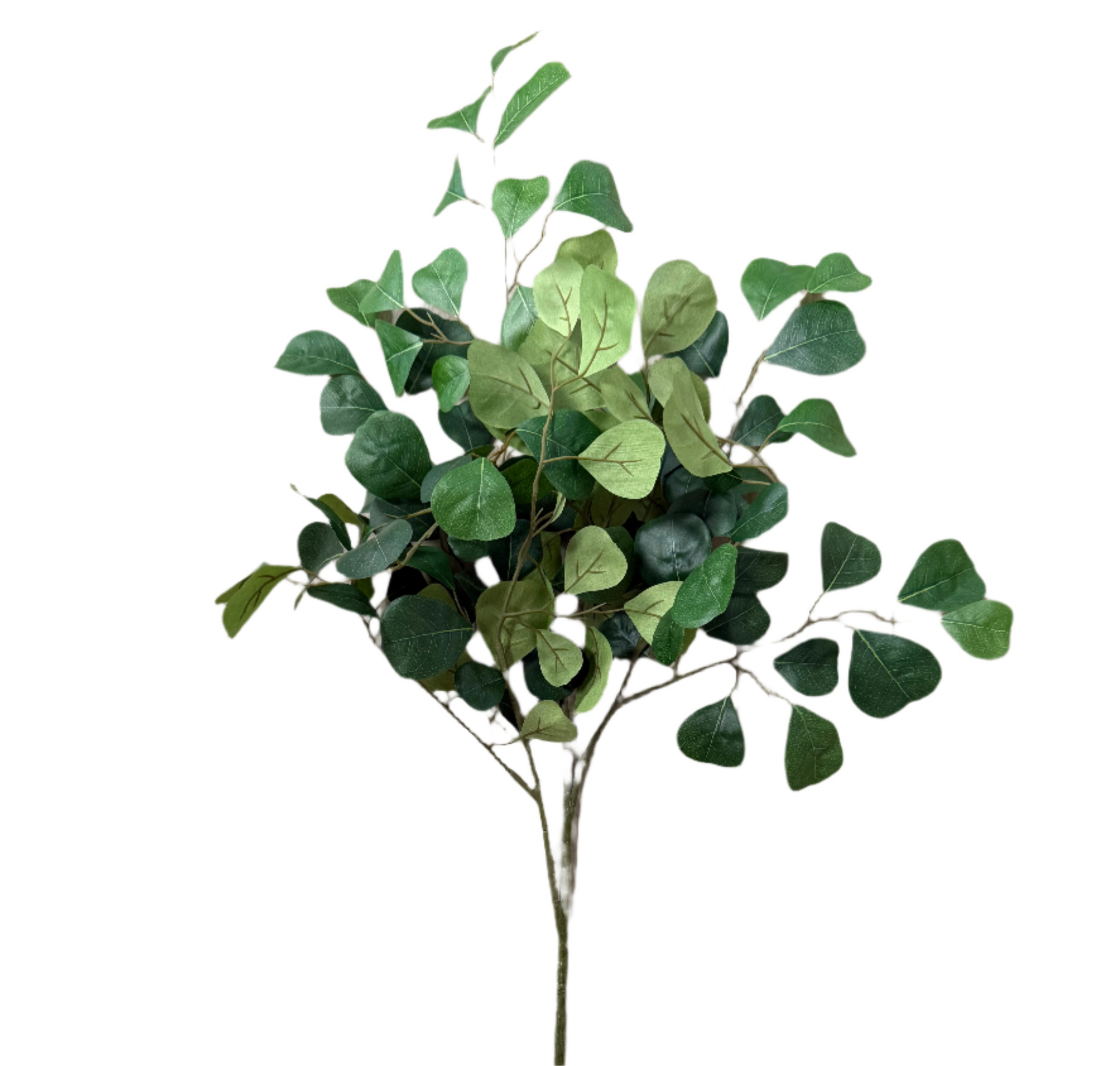 Open Box Item- Add a touch of greenery to your floral arrangements with this elegant faux Eucalyptus Stem. It boasts a durable dark brown plastic stem with textured ridges and multiple branches adorned with broad, deep green eucalyptus leaves. Measuring approximately 44" by 19.5" (shape-dependent), this fabric and plastic piece is designed for indoor use, bringing natural beauty without maintenance. This item is open box and in excellent condition.