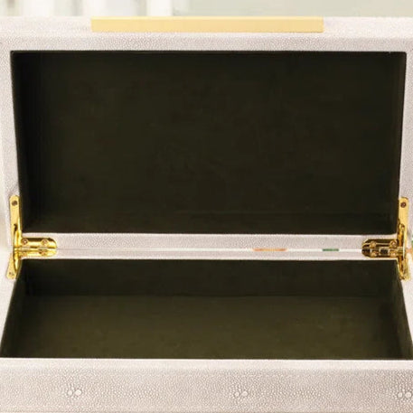 This elegant set includes two faux ivory shagreen leather boxes, perfect for stylishly storing jewelry, office essentials, or keepsakes. Each box features a brushed gold metal handle and is lined with a rich green velvet interior for a luxurious finish. Both functional and decorative, they’re ideal for use on dressers, desks, or shelves.