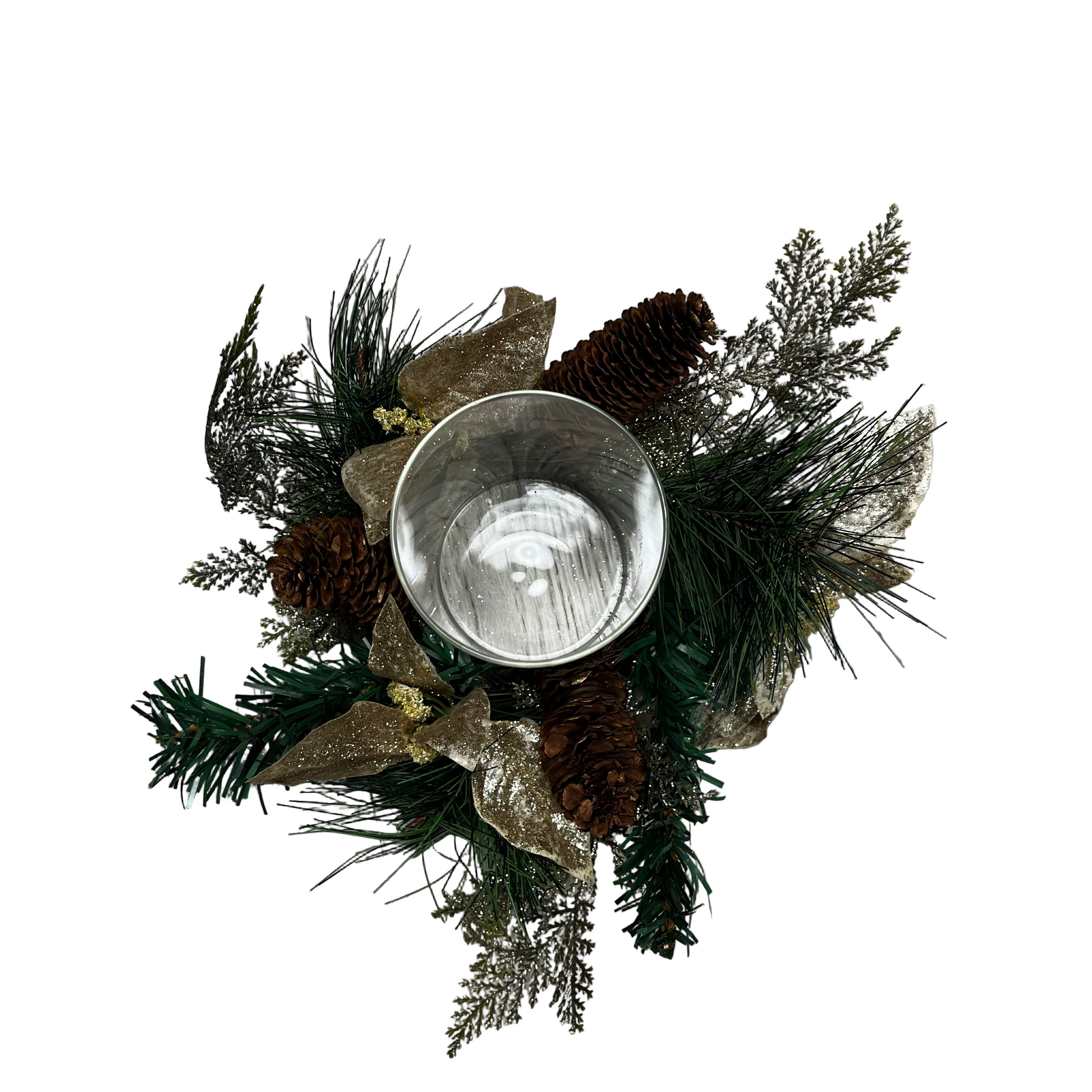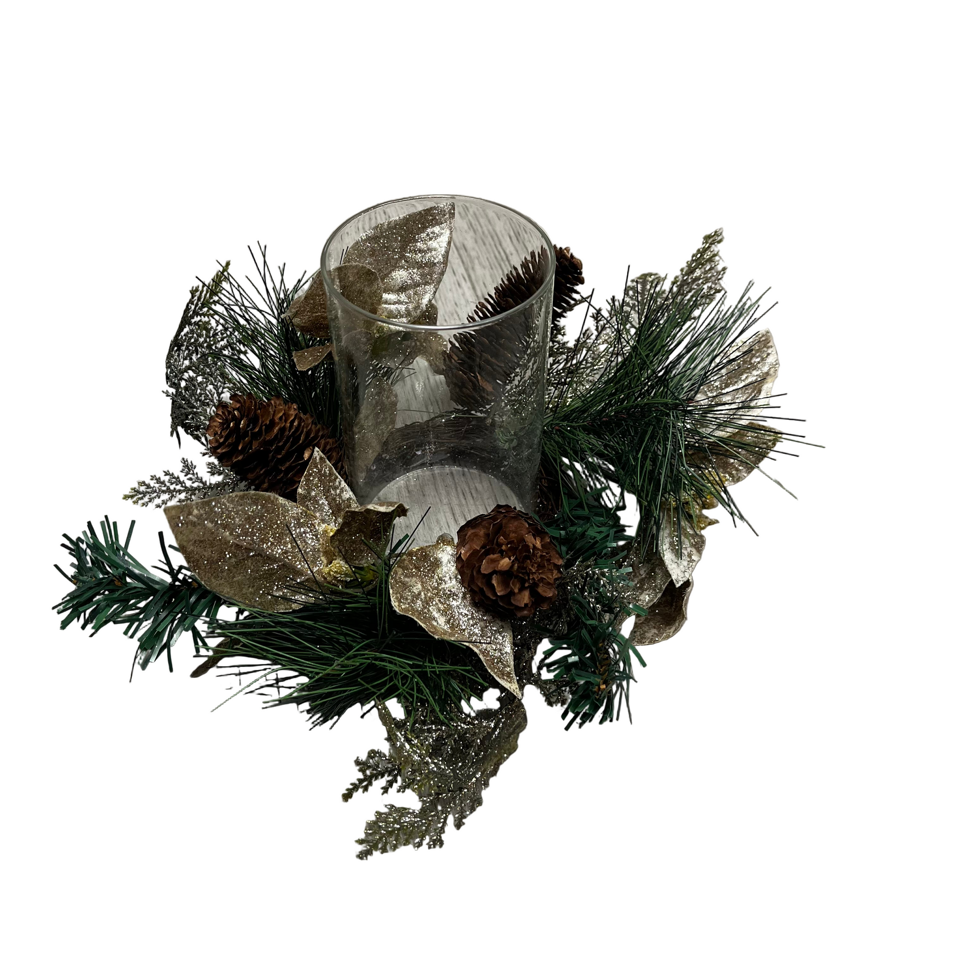 Add a warm, festive glow to your home with this elegant hurricane candle holder surrounded by a lush winter arrangement. The clear glass hurricane is nestled within a beautifully crafted mix of artificial pine needles, natural-style pinecones, and shimmering gold and silver foliage, creating a perfect balance of sparkle and seasonal charm.