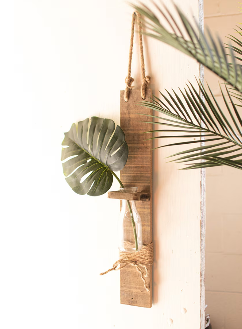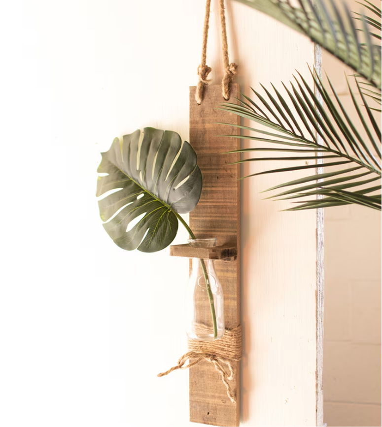 Glass Bottle Bud Vase on Recycled Wood with Rope Hanger