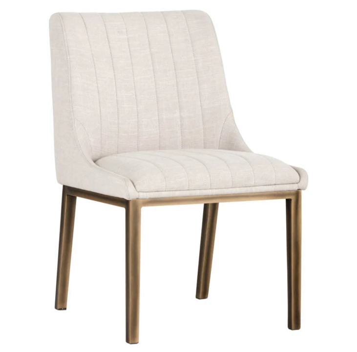 Description: Introducing the Halden Dining Chair - a sleek and urban design that will add a touch of retro style to any dining or office space. Its bold vertical stitching on the seat and back, available in faux leather or linen fabric, adds a unique touch to this piece. The rustic bronze steel frame provides a sturdy and stylish base.
