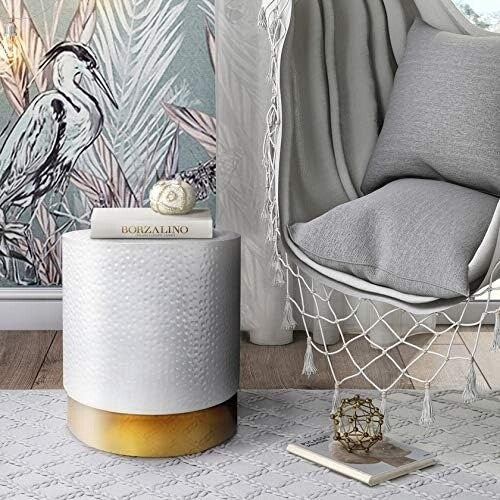 Description: Update your home decor with this handcrafted hammered side table, perfect for small spaces. The White marble-like top and sides are sprinkled with dimples, reminiscent of a golf ball, and paired with a glimmering gold base for added luxury. Don't miss out on this one-of-a-kind table, gently used for staging and available for local pick-up only. Measures 16"L x 16"W x 18"H and weighs 19.8 lbs. (Note: Assembly not required.)