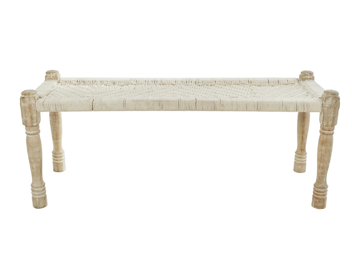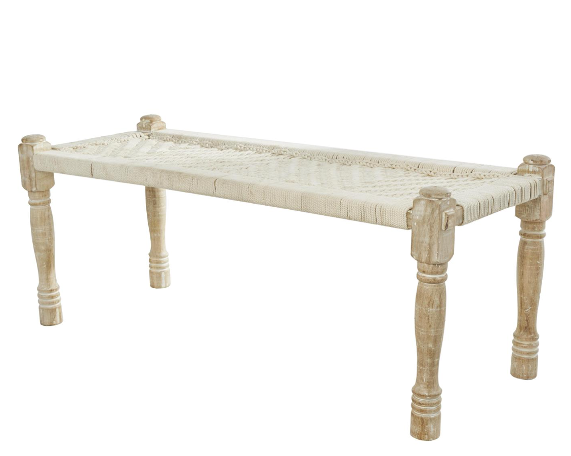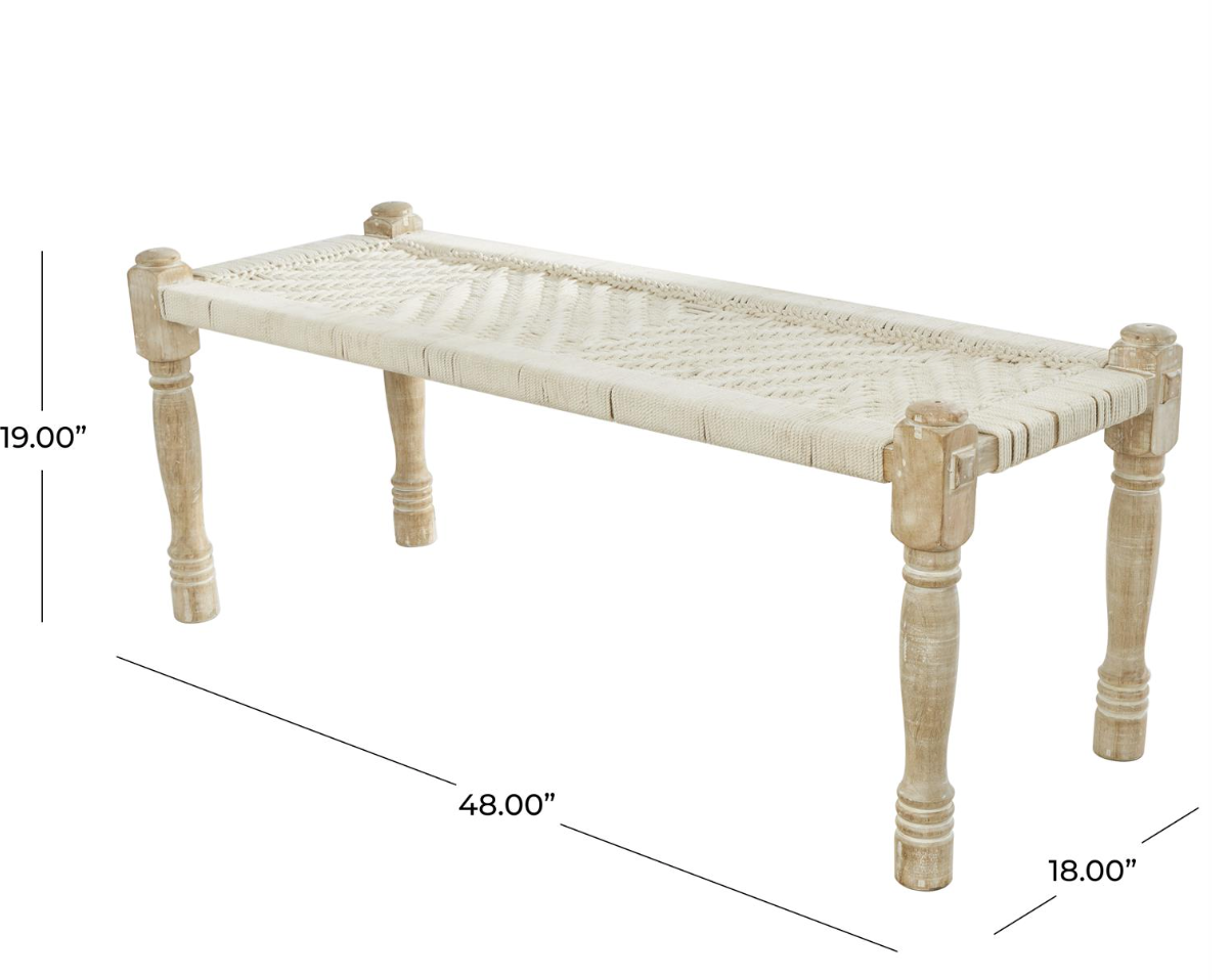 Perfect for entryways, living rooms, or bedrooms, this washed beige bench adds an artistic and inviting touch to any space.