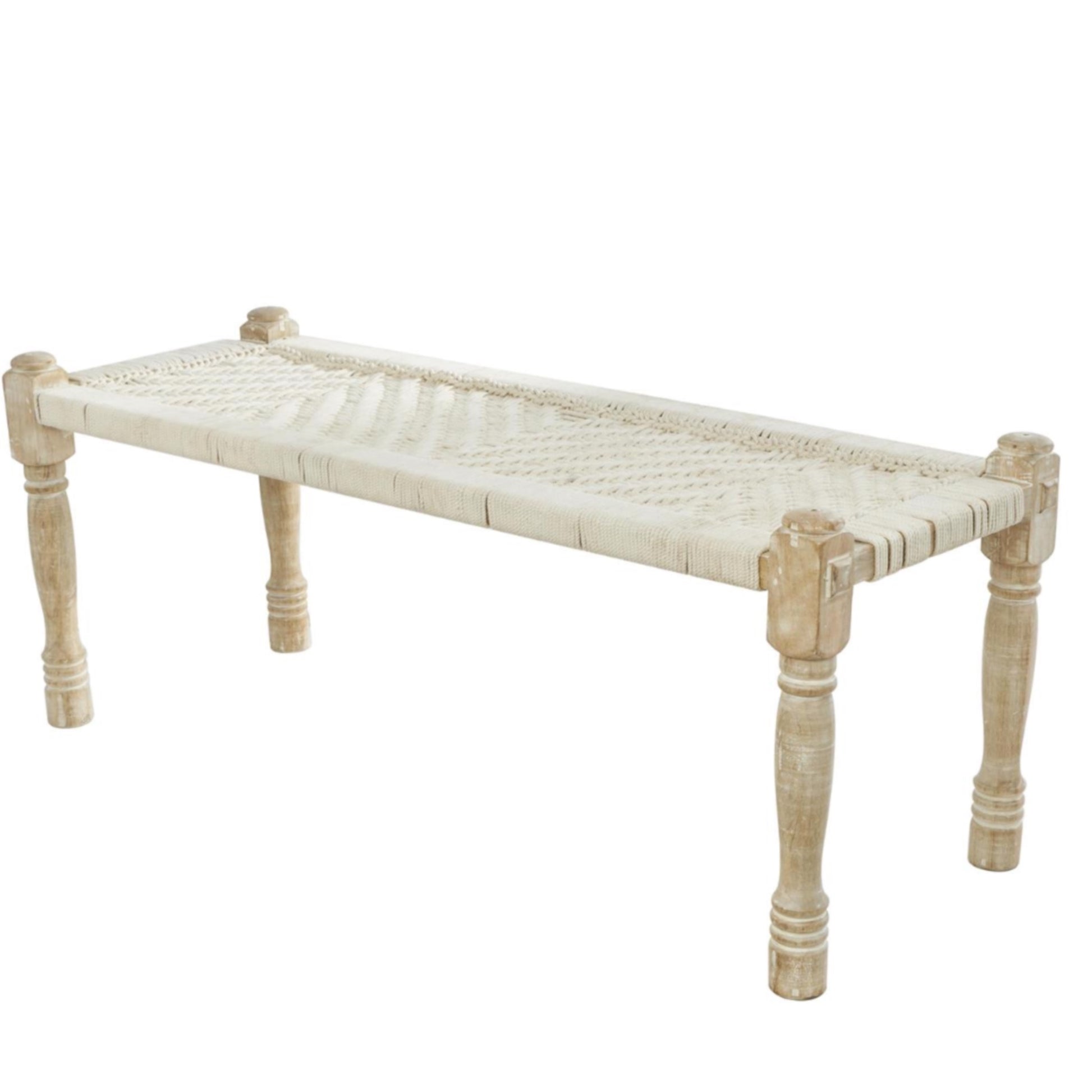 - Material: Soft cotton upholstery with a handwoven chevron pattern, supported by sturdy mango wood legs in a light brown finish.