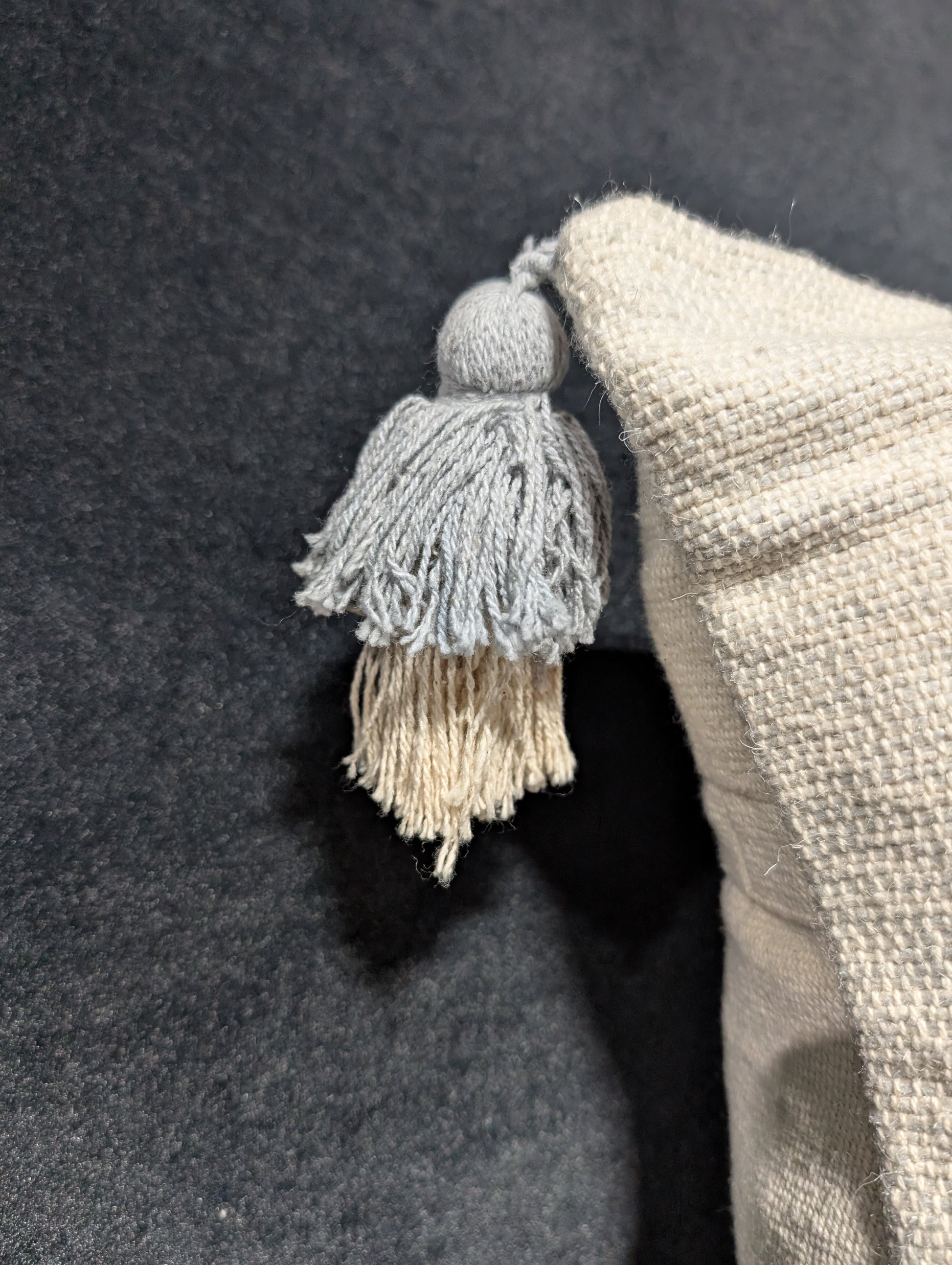 Elevate any space with this exquisite, handwoven Ivory Bohemian Pillow. Crafted from soft, textured cotton, this square pillow features a beautiful, neutral ivory hue that effortlessly complements any decor style.The tightly woven fabric offers a rich, tactile experience and durable quality. Adorned with chic, dual-toned tassels in natural beige and soft gray at each corner, adding a playful, bohemian flair.