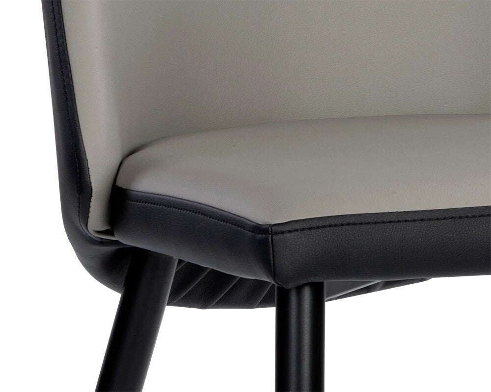 Smooth curves define this modern dining chair made distinct by its rounded seatback. The front is upholstered with dillon stratus faux leather and dillon black faux leather in the back. Completed with black powder-coated steel legs with gold caps. Handle With Care: This design has been crafted with faux leather. Faux leather is manufactured to reflect the natural characteristics of leather; as such, colour variations, markings wrinkles, grooves, and light scratches are appreciated characteristics. No two pieces will be alike. Visit our Product Care page for more information on how to ensure the lasting beauty of this piece.
