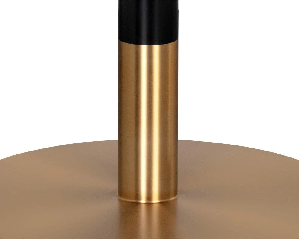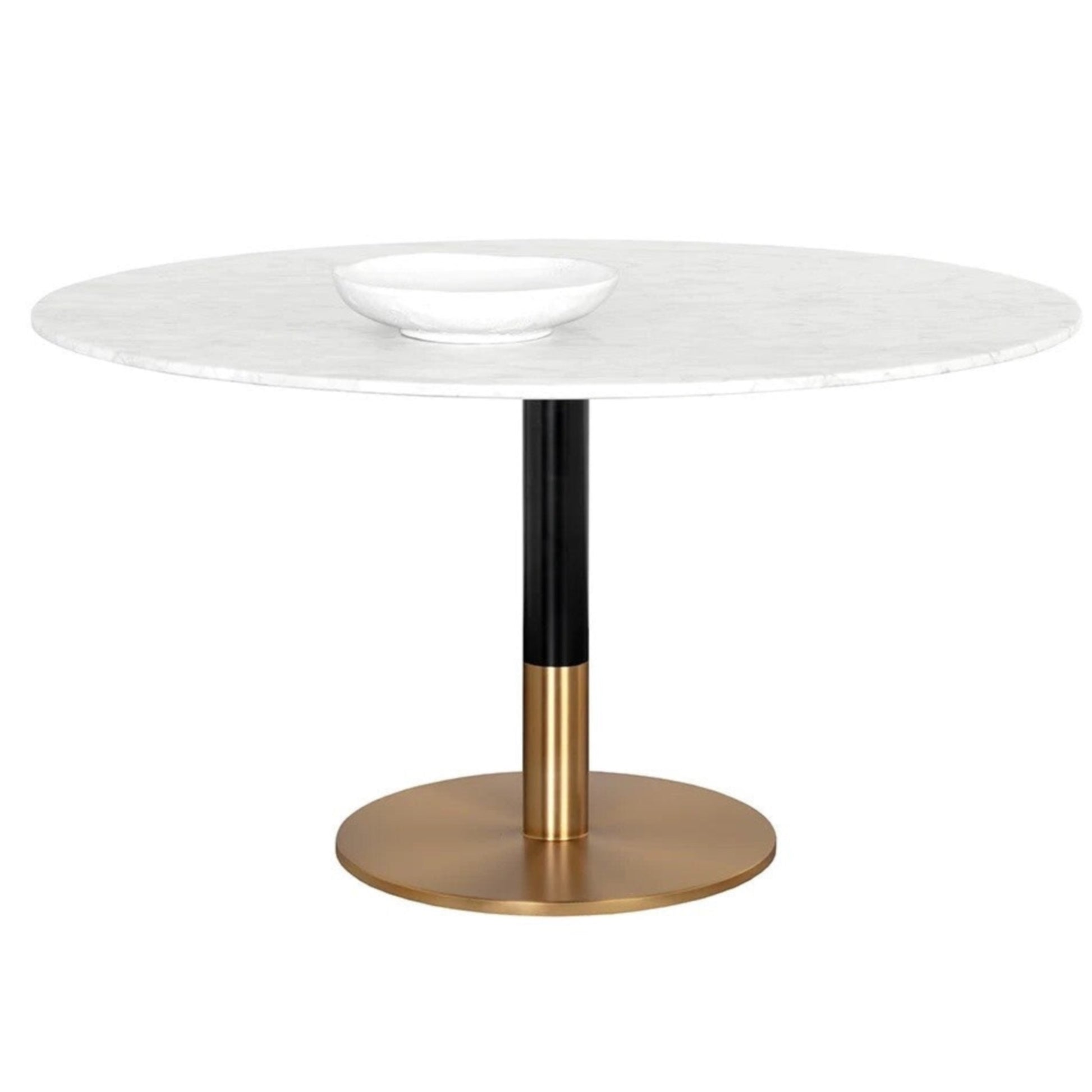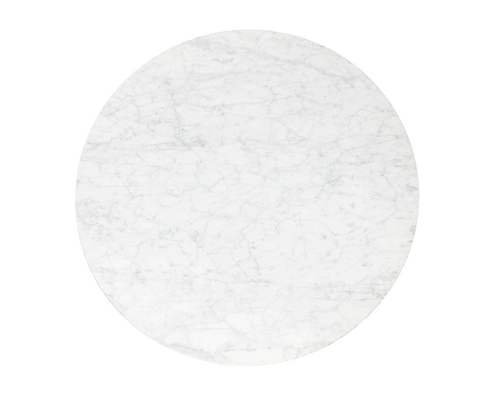 A round dining table inspired by Art Deco luxury. Features a white Carrara marble table top with a striking black and gold steel base. As marble is a natural material, unique veining, pitting, fissures, micro-cracks and colour variations are all characteristics that add to the uniqueness and beauty of each piece.