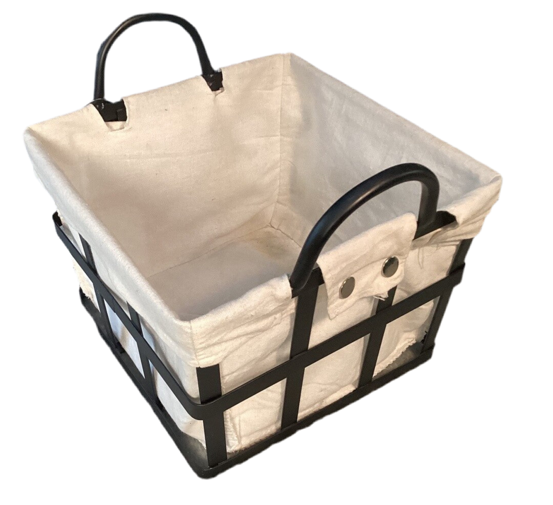 Black metal basket with fabric insert. 10"x10"x7" Gently used for staging.
