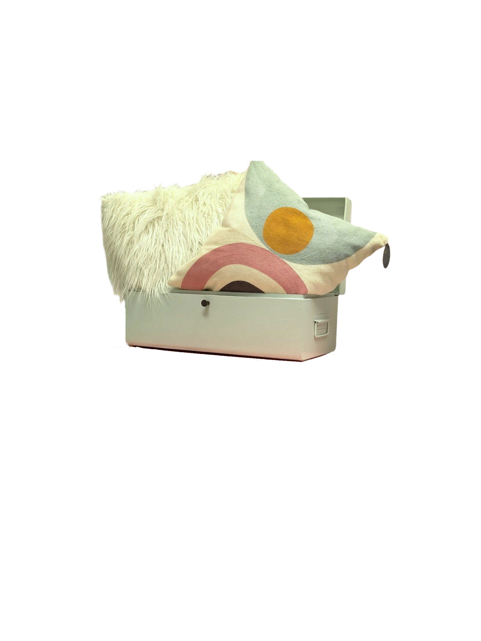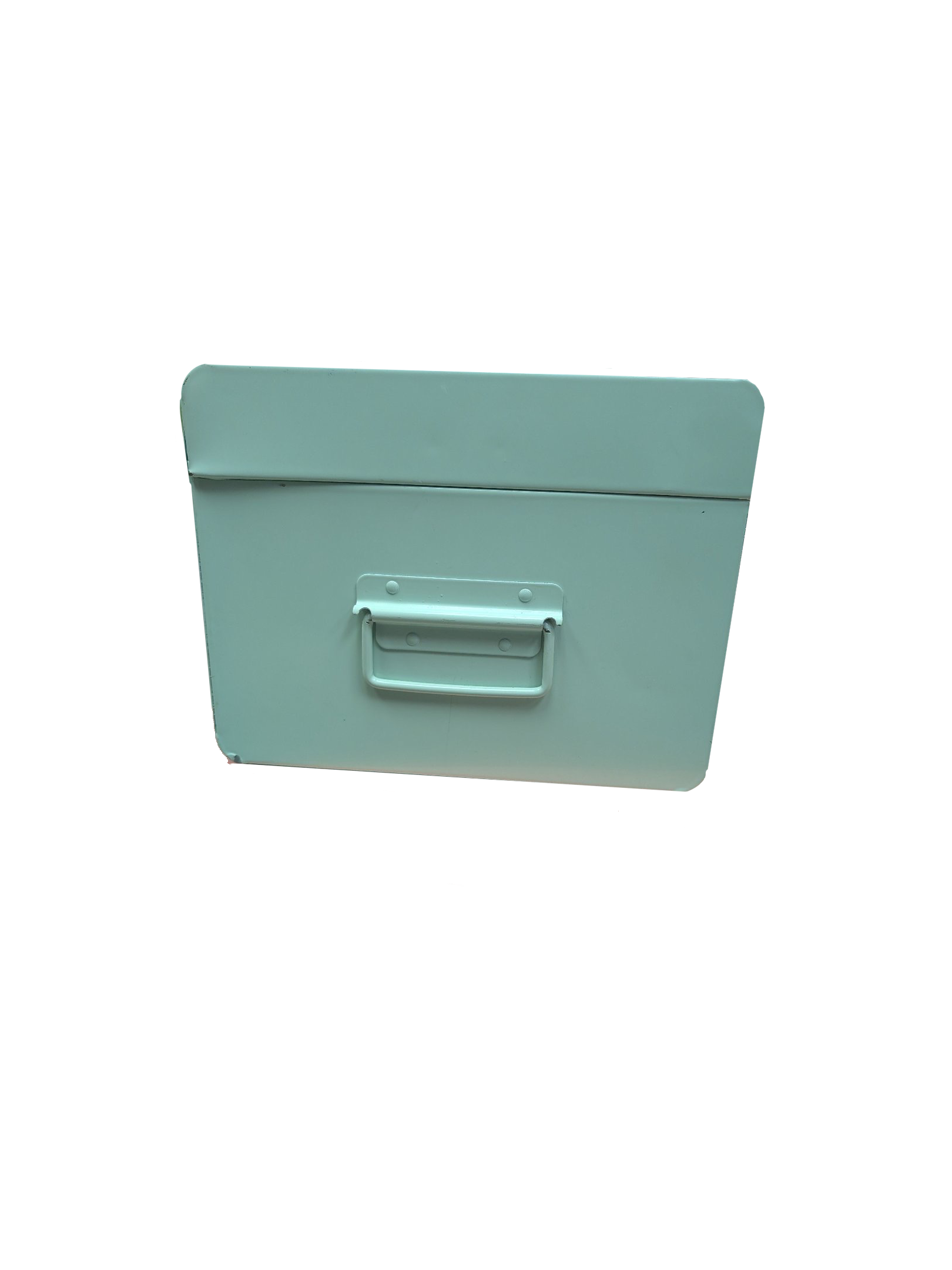 Description: Mint metal storage bin with side handles that can be used for decor and storage. Local pick up only.