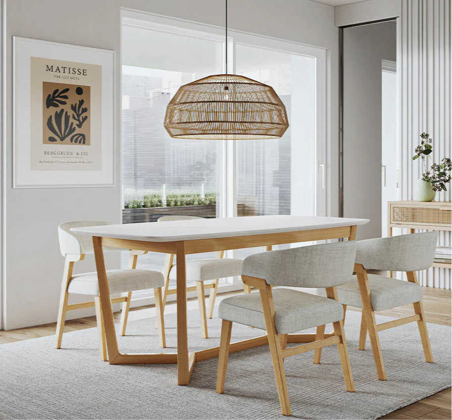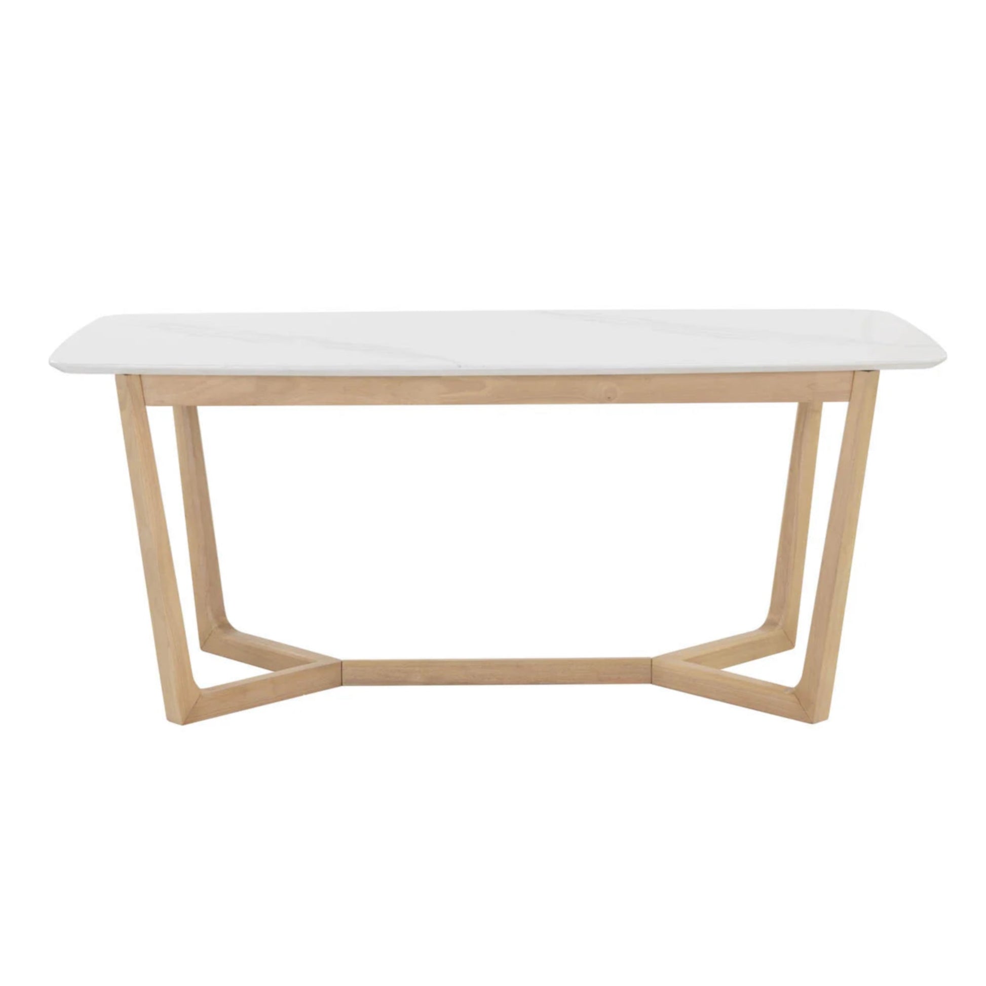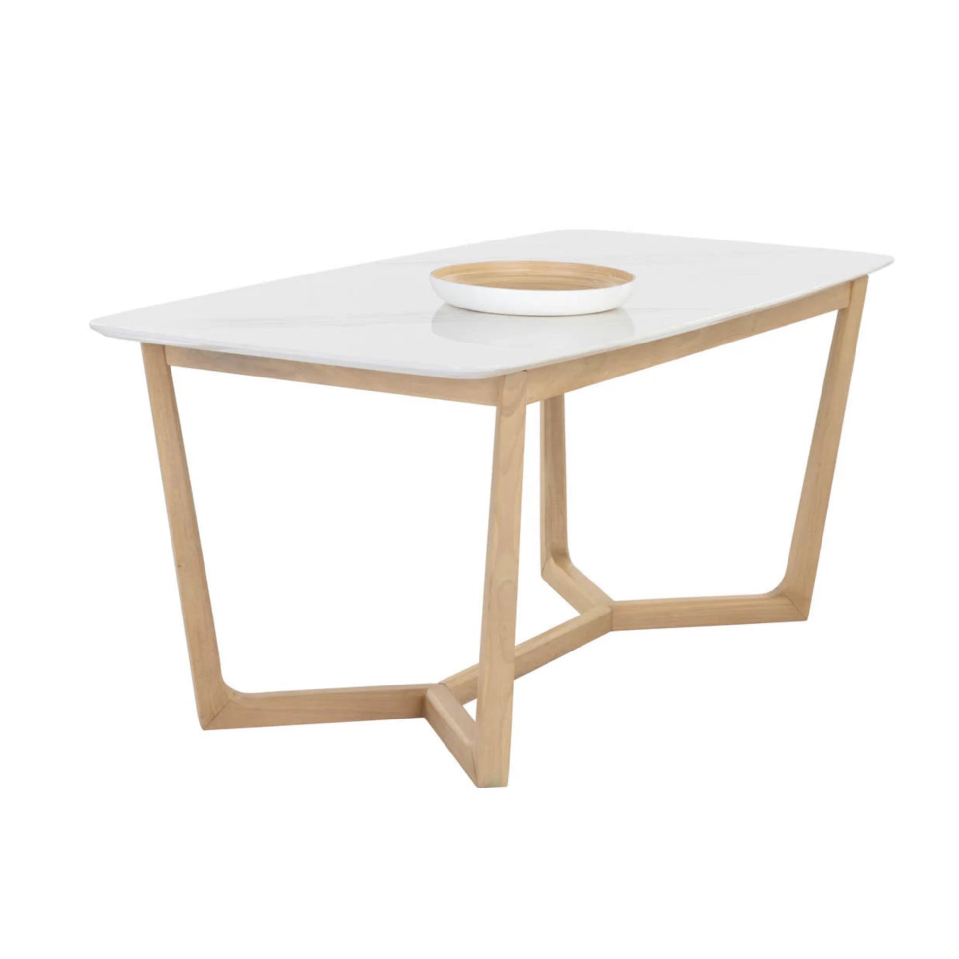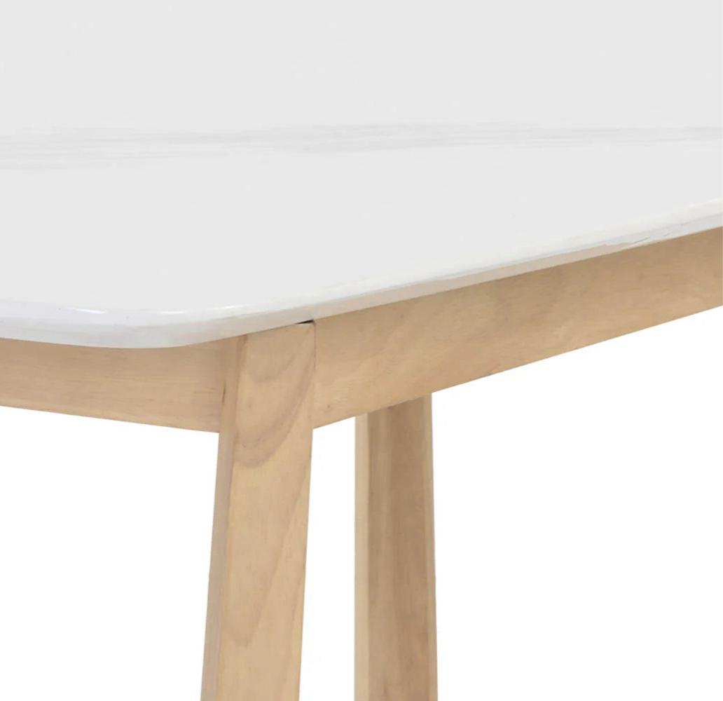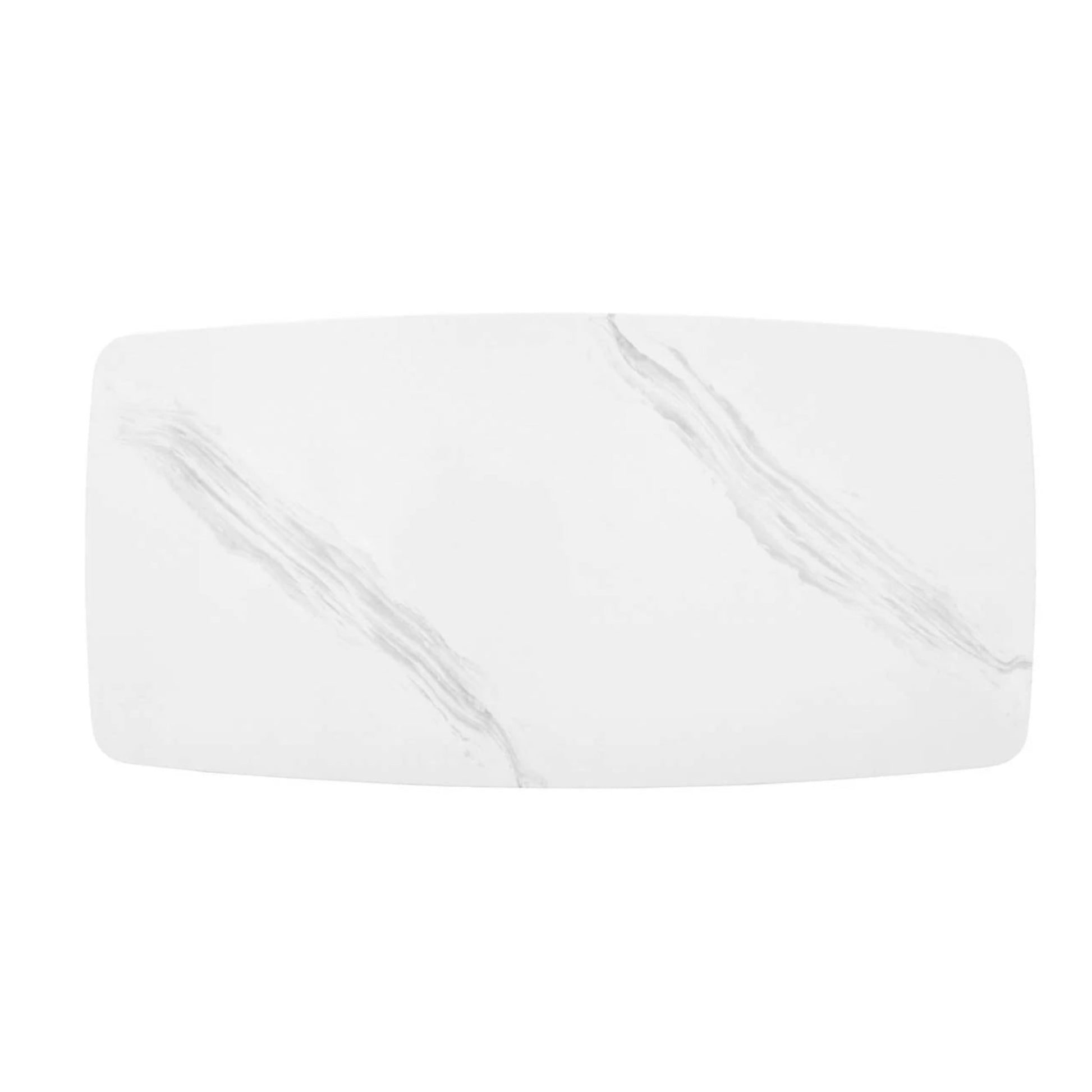 Modern and contemporary dining table. Stylish and unique with a faux marble top, glossy finish, and solid rubberwood base.
