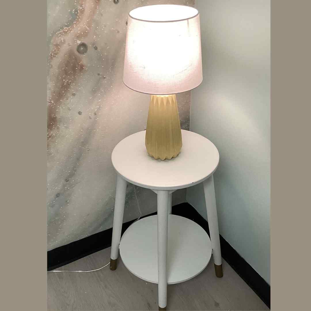 Description: This set of two modern white pedestal side tables is a great find! The dimensions (24 inches in height, 14 inches in length, and 14 inches in width) suggest that they are perfect for small spaces or as accent pieces in various rooms. The tables are in good condition with only a few small scratches and chips, which should be visible in the photos. (Gently used for staging)