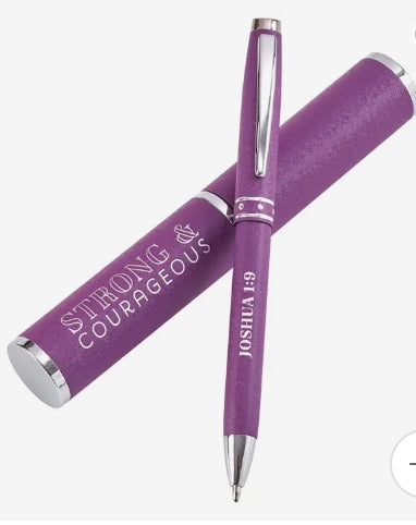 A purple pen in a matching case, printed with Joshua 1:9. A daily dose of courage with every note or list.
