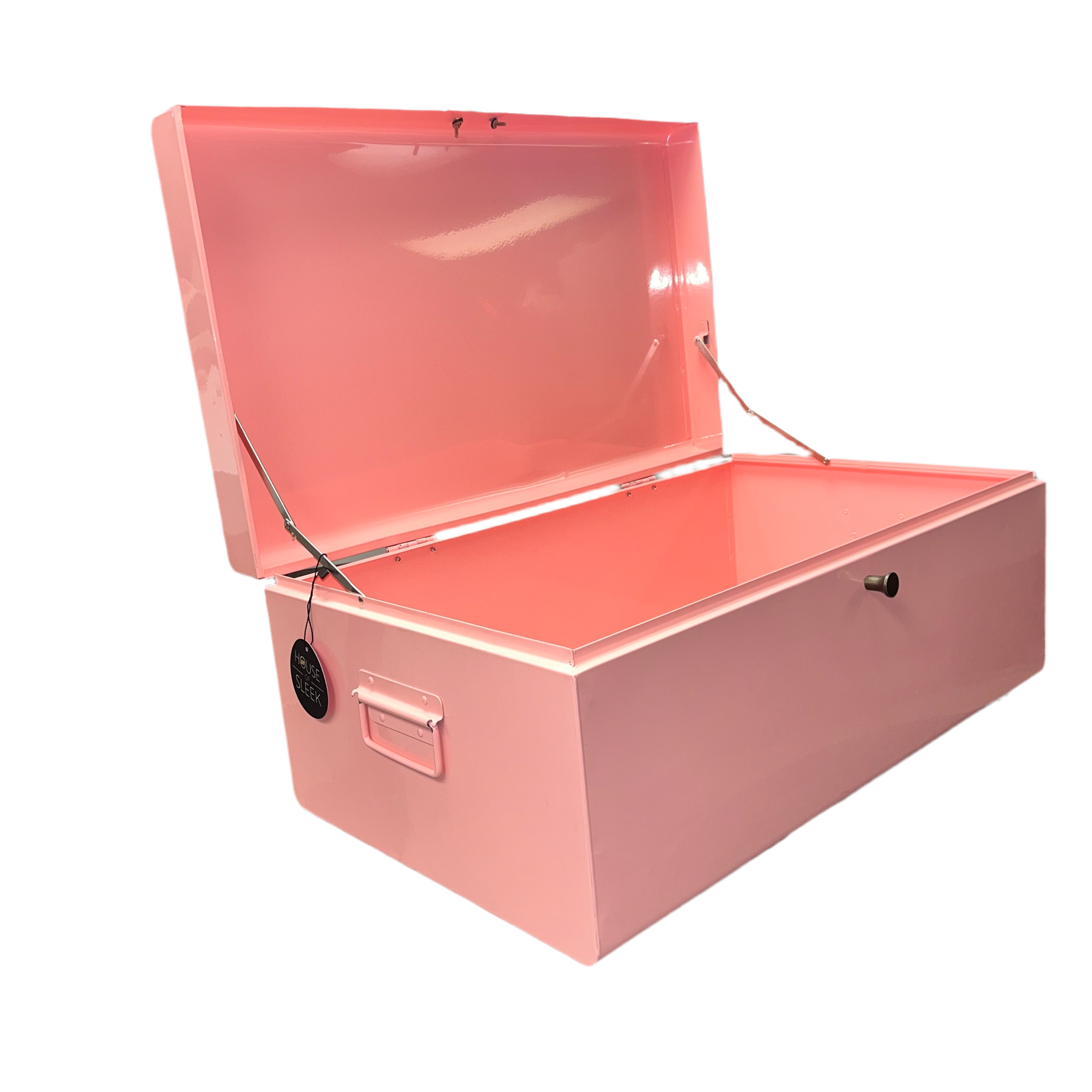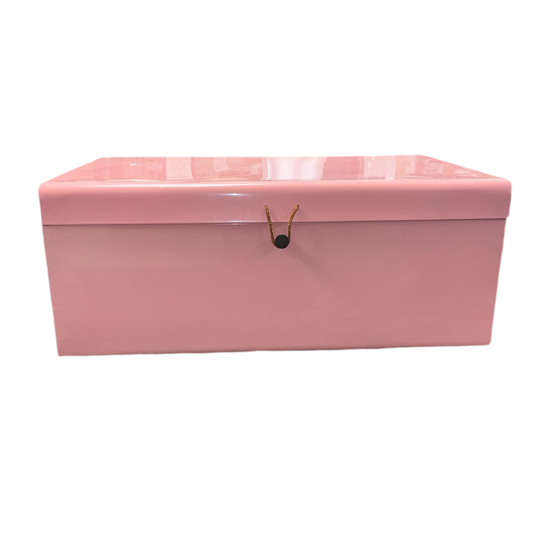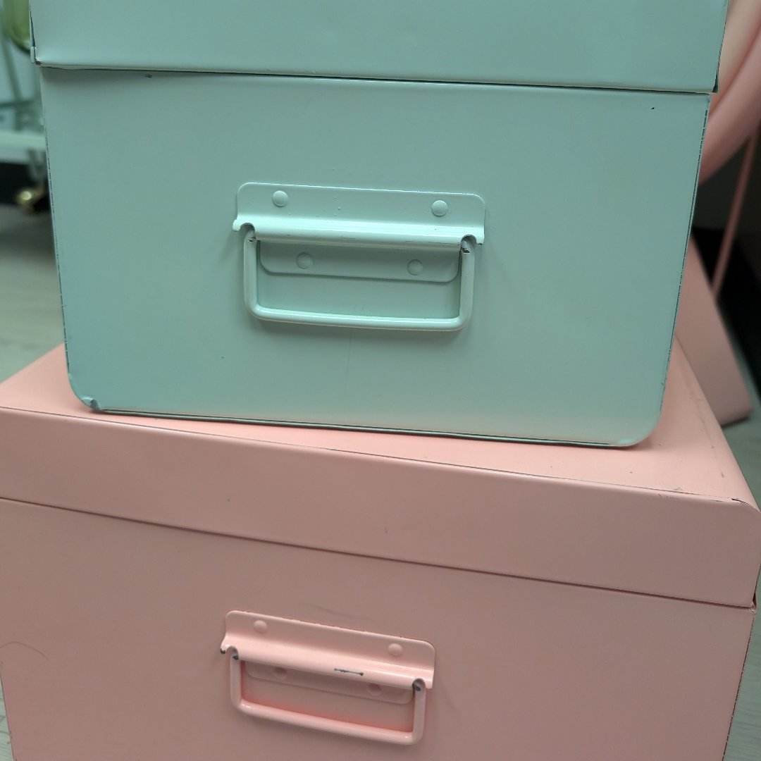 Description: Pink metal storage bin with side handles that can be used for decor and storage. Gently used for staging. Local pick up only.
