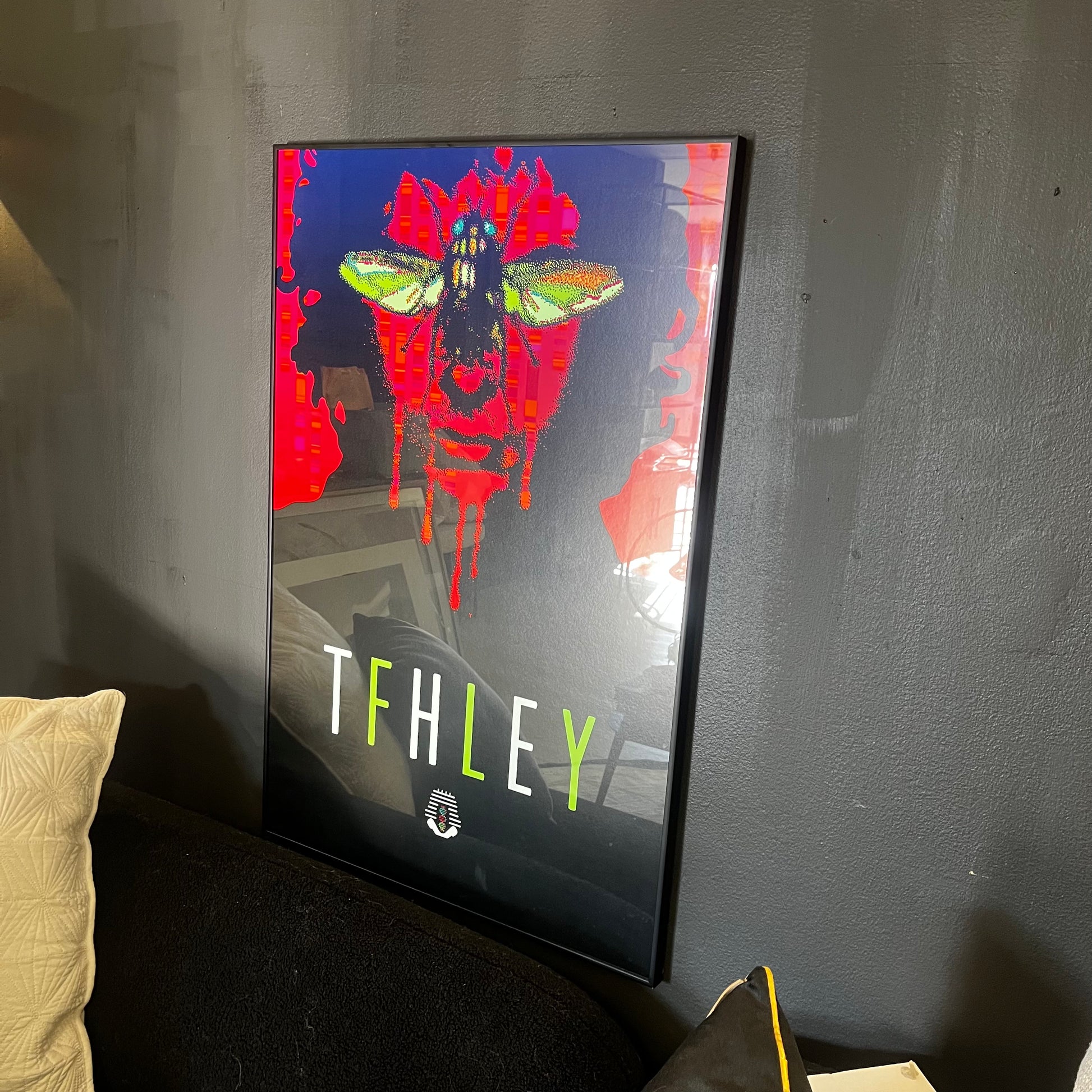 This open box framed edition of The Fly Movie Poster showcases a compelling glitch art design centered around a distinctive insect-like figure, paired with the bold text "TFHLEY." Its artistic approach adds a modern, sophisticated dimension to any collection, making it an intriguing piece for enthusiasts of unique visual styles and classic film memorabilia.