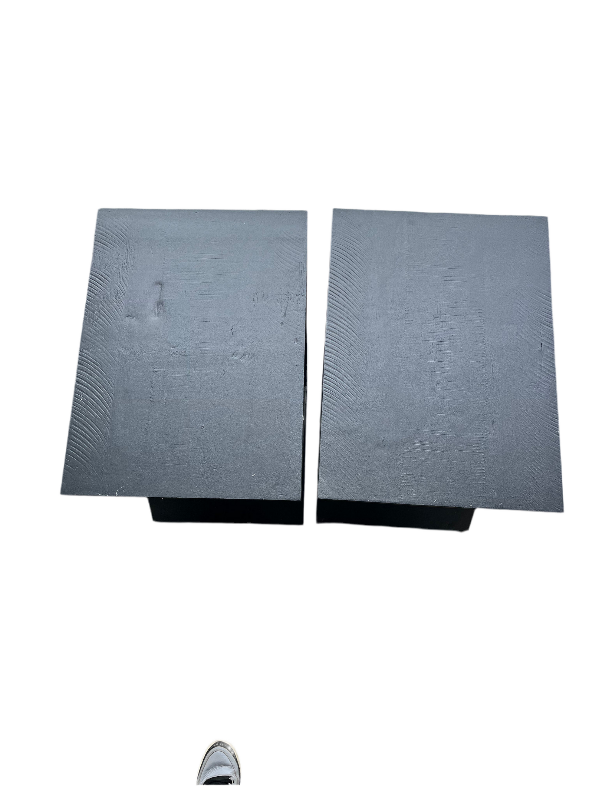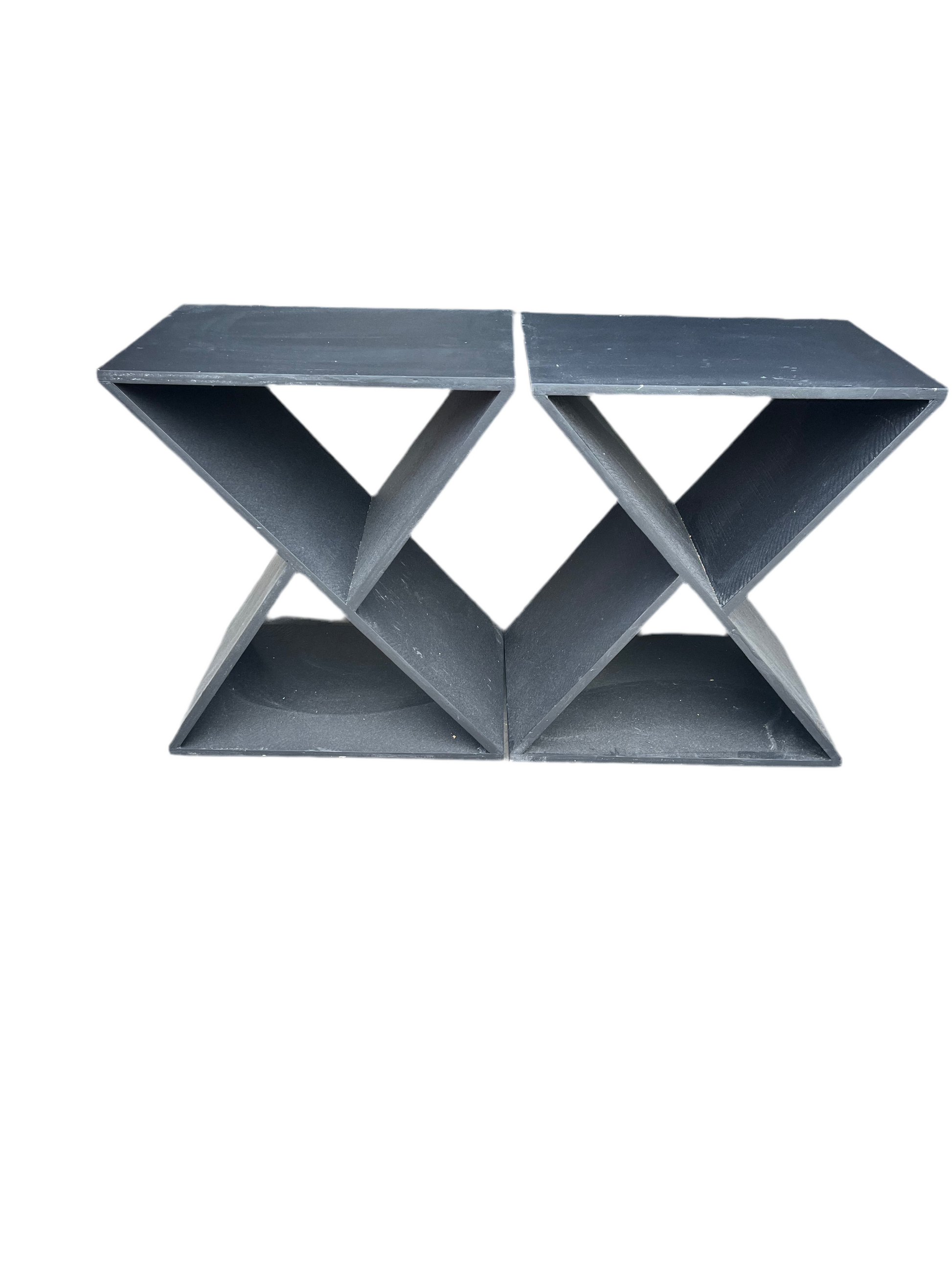 Give your space a refresh with these two Black Triangle Side Tables. A piece of art in itself, this side table is as pleasing to the eye as it is useful to the guest sitting next to it. Made of rough sawn mango wood and glossed over in a black treatment stain, the triangular structure introduces a lively contrast to more traditional decor settings. With a height of just under 25, it’s best suited next to a couch or set of chairs, beside a bed or as an auxiliary surface in an office space. LOCAL PICK UP ONLY