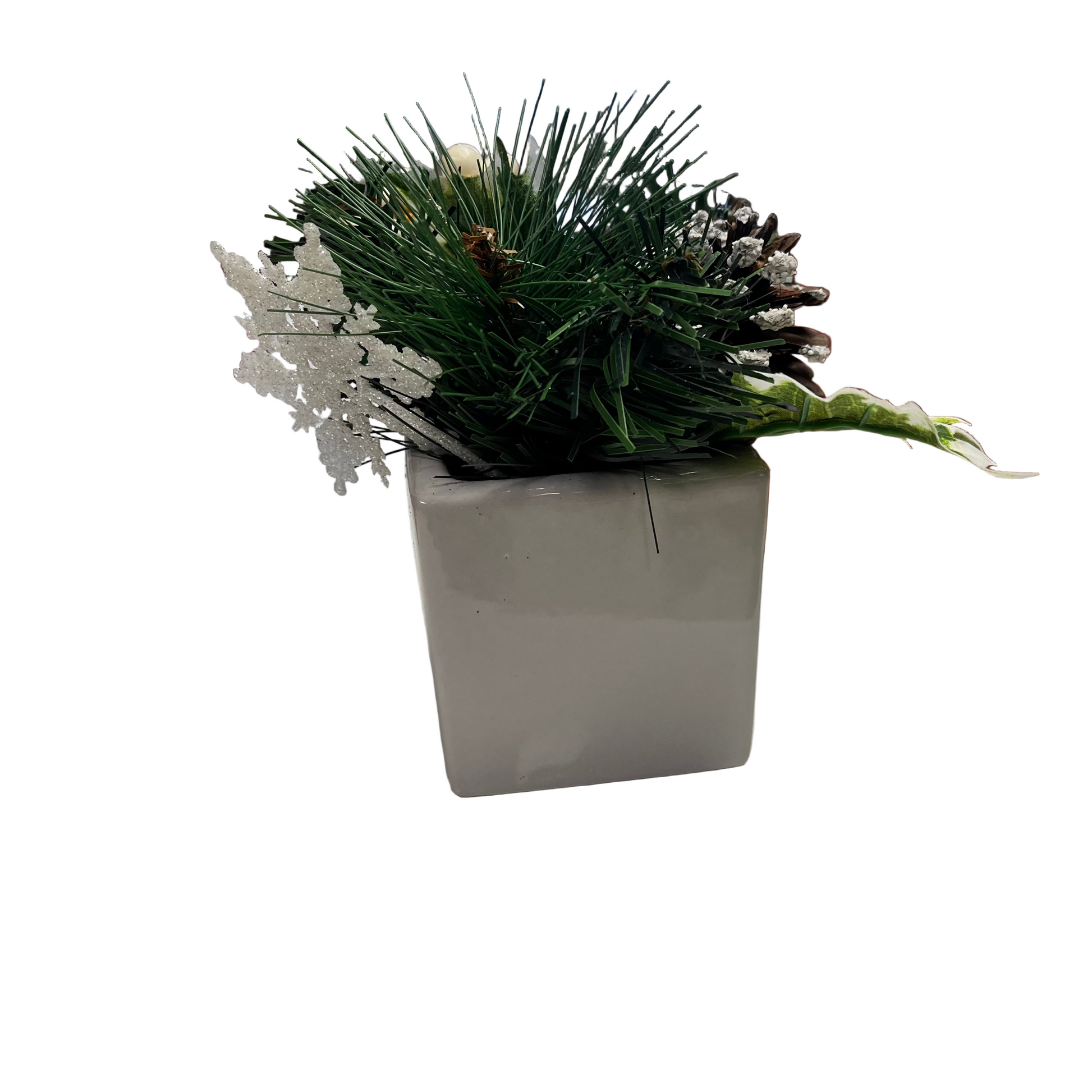Bring a touch of winter elegance to your home with this charming white berry and pinecone floral arrangement. Set in a sleek white ceramic container, it features a lush mix of greenery, pinecones, and frosted berries, creating a timeless look that complements any décor style.