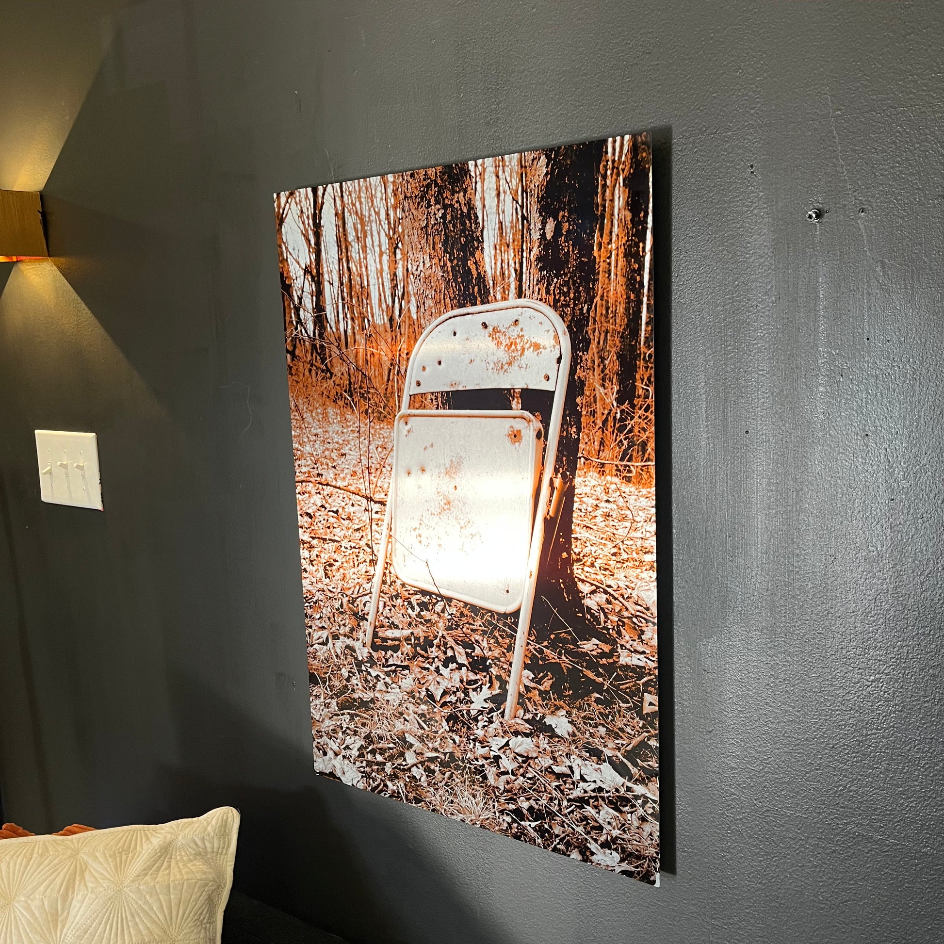 Capture the evocative beauty of forgotten stories and resilient nature with "Forgotten Rust," a striking metal wall art print featuring a vintage folding chair amidst a serene, wooded landscape. This piece brings a touch of rustic charm and contemplative elegance to any space, printed with stunning clarity directly onto durable metal for a modern, frameless presentation.