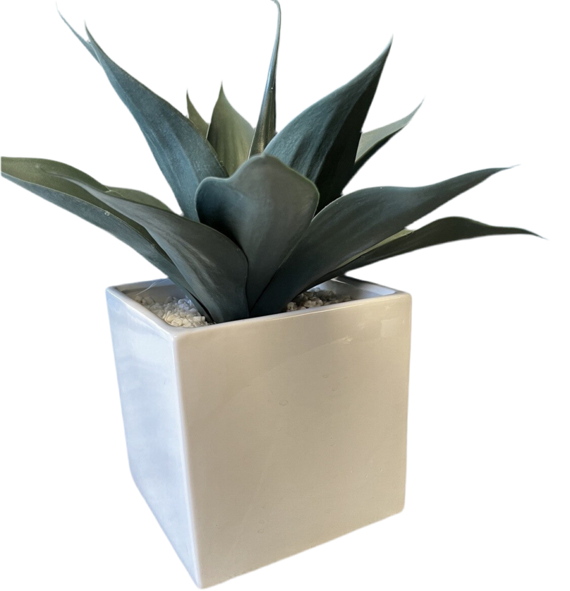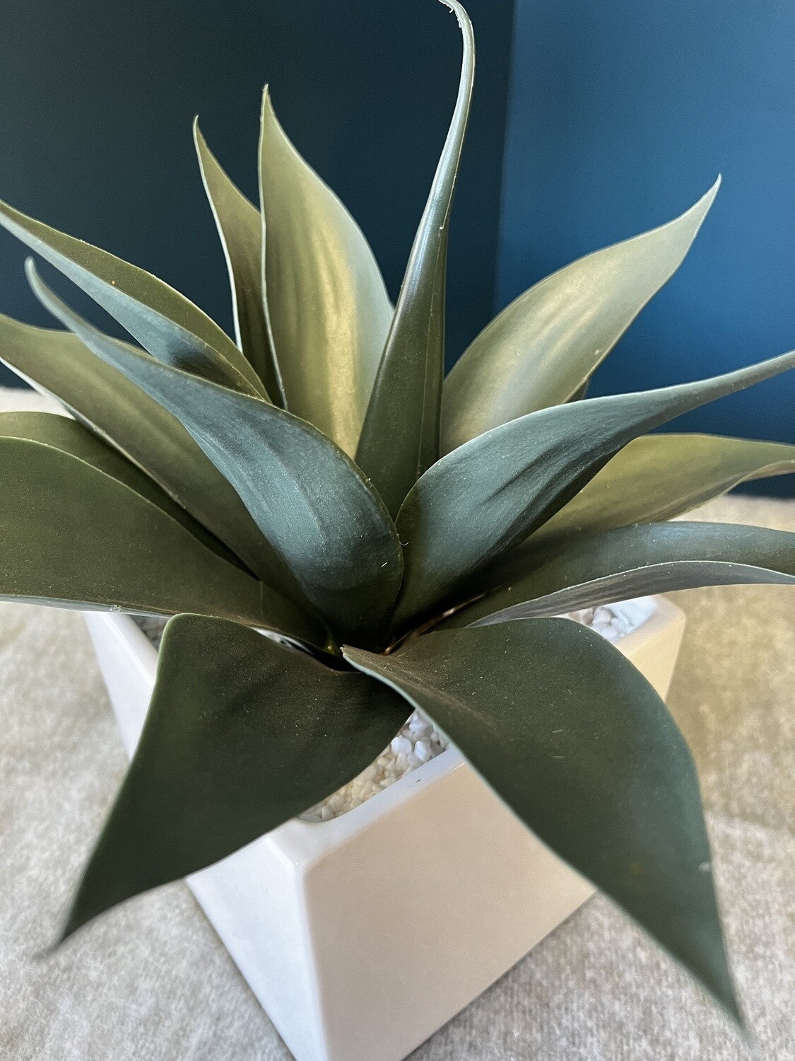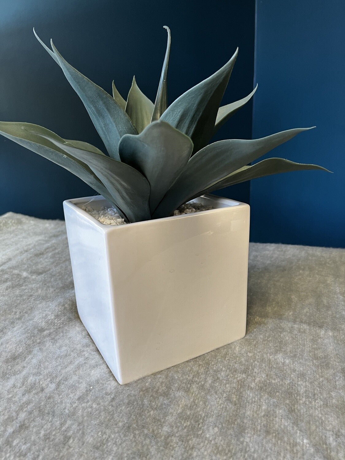 Description: Cute decorative accent faux plant, would look nice in a home or office setting. Great condition, gently used for staging. 7"w x 7"h, 16"h with plant.