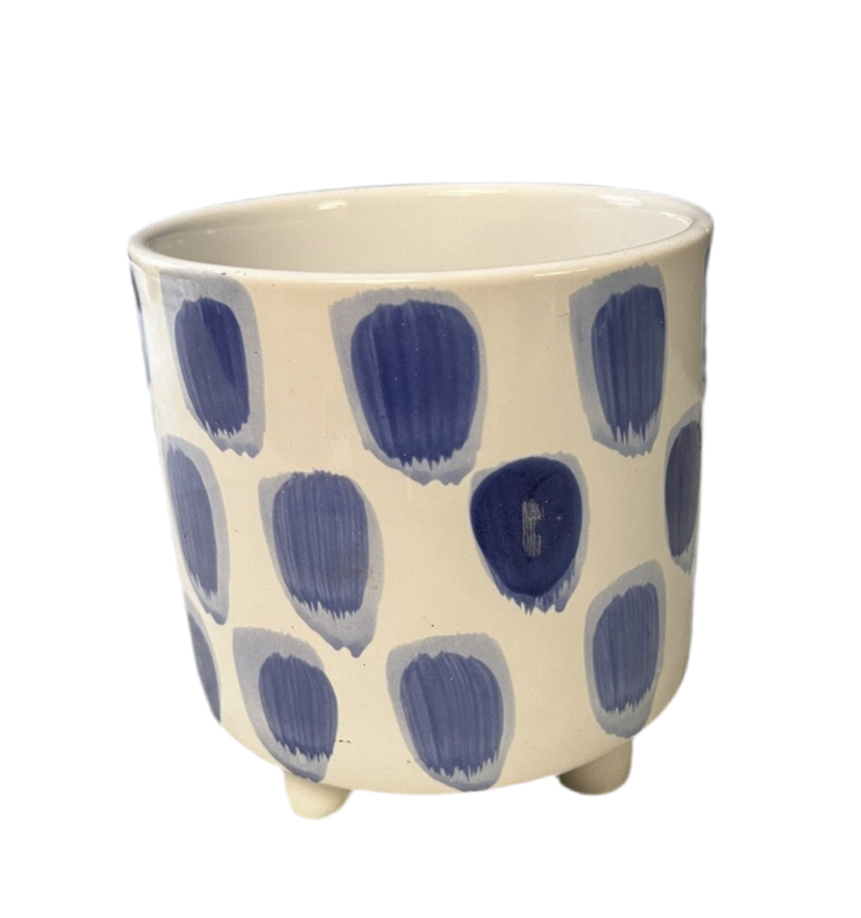 Description: White and blue planter. 5.5"d x 5"h. Gently used for staging.